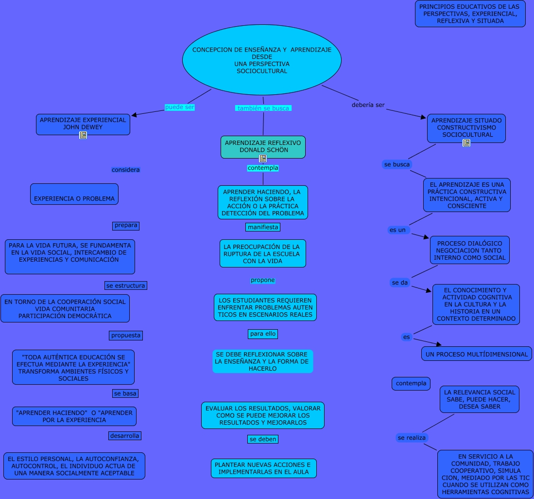 Este Cmap, tiene información relacionada con: PRINCIPIOS EDUCATIVOS, CONCEPCION DE ENSEÑANZA Y APRENDIZAJE DESDE UNA PERSPECTIVA SOCIOCULTURAL puede ser APRENDIZAJE EXPERIENCIAL JOHN DEWEY, LOS ESTUDIANTES REQUIEREN ENFRENTAR PROBLEMAS AUTEN TICOS EN ESCENARIOS REALES SE DEBE REFLEXIONAR SOBRE LA ENSEÑANZA Y LA FORMA DE HACERLO se deben, PROCESO DIALÓGICO NEGOCIACION TANTO INTERNO COMO SOCIAL se da EL CONOCIMIENTO Y ACTIVIDAD COGNITIVA EN LA CULTURA Y LA HISTORIA EN UN CONTEXTO DETERMINADO, EL CONOCIMIENTO Y ACTIVIDAD COGNITIVA EN LA CULTURA Y LA HISTORIA EN UN CONTEXTO DETERMINADO es UN PROCESO MULTÍDIMENSIONAL, CONCEPCION DE ENSEÑANZA Y APRENDIZAJE DESDE UNA PERSPECTIVA SOCIOCULTURAL también se busca APRENDIZAJE REFLEXIVO DONALD SCHÖN, LA RELEVANCIA SOCIAL SABE, PUEDE HACER, DESEA SABER se realiza EN SERVICIO A LA COMUNIDAD, TRABAJO COOPERATIVO, SIMULA CION, MEDIADO POR LAS TIC CUANDO SE UTILIZAN COMO HERRAMIENTAS COGNITIVAS, EL APRENDIZAJE ES UNA PRÁCTICA CONSTRUCTIVA INTENCIONAL, ACTIVA Y CONSCIENTE es un PROCESO DIALÓGICO NEGOCIACION TANTO INTERNO COMO SOCIAL, CONCEPCION DE ENSEÑANZA Y APRENDIZAJE DESDE UNA PERSPECTIVA SOCIOCULTURAL debería ser APRENDIZAJE SITUADO CONSTRUCTIVISMO SOCIOCULTURAL, LA PREOCUPACIÓN DE LA RUPTURA DE LA ESCUELA CON LA VIDA propone para ello, APRENDIZAJE SITUADO CONSTRUCTIVISMO SOCIOCULTURAL se busca EL APRENDIZAJE ES UNA PRÁCTICA CONSTRUCTIVA INTENCIONAL, ACTIVA Y CONSCIENTE, APRENDIZAJE EXPERIENCIAL JOHN DEWEY considera EXPERIENCIA O PROBLEMA, APRENDIZAJE REFLEXIVO DONALD SCHÖN contempla APRENDER HACIENDO, LA REFLEXIÓN SOBRE LA ACCIÓN O LA PRÁCTICA DETECCIÓN DEL PROBLEMA