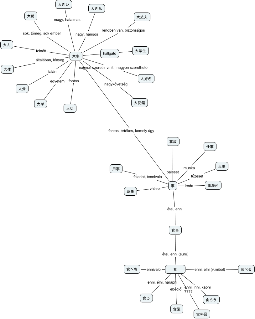 This Concept Map, created with IHMC CmapTools, has information related to: Abel, 大事 talán 大分, 食 enni, élni, harapni 食う, 食 ebédlő 食堂, 大事 sok, tömeg, sok ember 大勢, 食 enni, élni (v.miből) 食べる, 大事 fontos 大切, 大事 általában, lényeg 大体, 事 feladat, tennivaló 用事, 食 enni, inni, kapni 食らう, 食事 étel, enni 事, 大事 felnőtt 大人, 事 baleset 事故, 大事 rendben van, biztonságos 大丈夫, 事 fontos, értékes, komoly ügy 大事, 返事 válasz 事, 事 tűzeset 火事, 食 ???? 食料品, 食 ennivaló 食べ物, 食 étel, enni (suru) 食事, 大事 nagyon szeretni vmit., nagyon szerethető 大好き