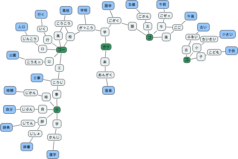 This Concept Map, created with IHMC CmapTools, has information related to: csilla_1118, 午 ごぜn 午前, 事 ジ 時, 辞 じてん 辞典, 事 ジ 字, 五 ごかん 五感, 語 ゴ 後, 子 こども 子供, 工 コー 高, 工 コー 校, 工 コー 公, 語 ゴ 午, 語 ゴ 五, 学 ごがく 語学, 工 コー 口, 工 こうじ 事, 工 コー 行, 事 ジ 辞, 後 ごご 午後, 工 こうじ 工事, 字 かんじ 漢字