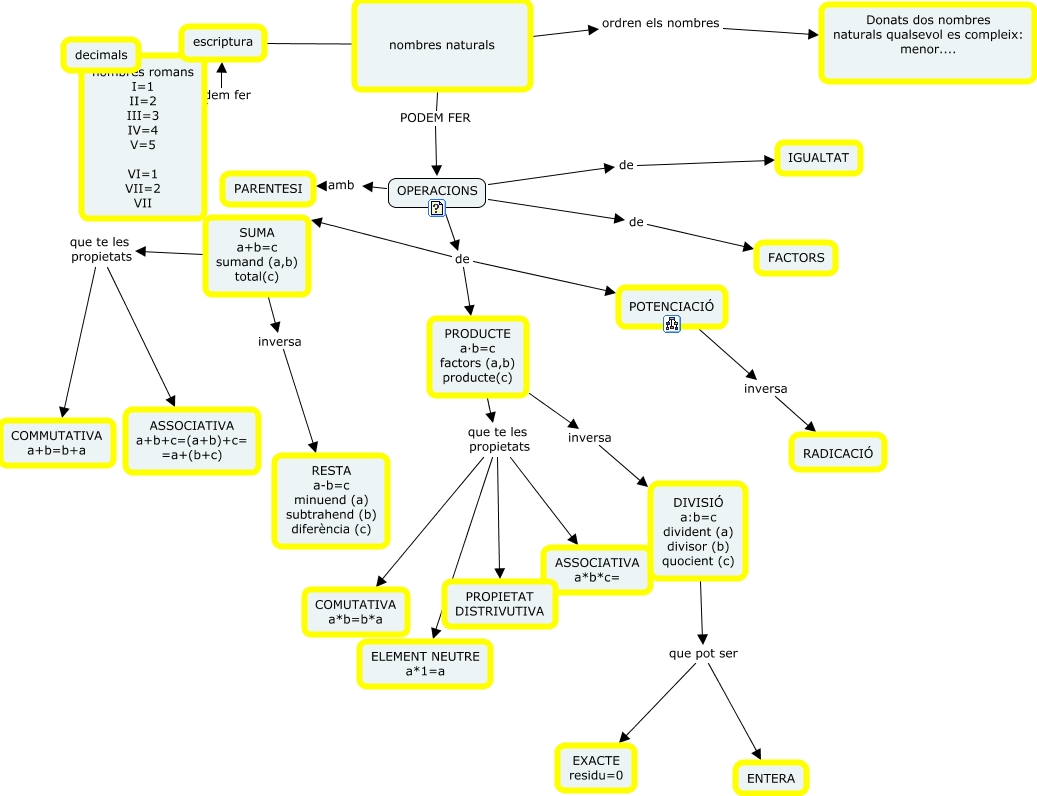 Aquest mapa conceptual conté informació relacionada amb: NOMBRES NATURALS, PRODUCTE a·b=c factors (a,b) producte(c) que te les propietats COMUTATIVA a*b=b*a, OPERACIONS de FACTORS, OPERACIONS de IGUALTAT, PRODUCTE a·b=c factors (a,b) producte(c) que te les propietats ASSOCIATIVA a*b*c=, OPERACIONS de POTENCIACIÓ, nombres naturals ordren els nombres Donats dos nombres naturals qualsevol es compleix: menor...., PRODUCTE a·b=c factors (a,b) producte(c) que te les propietats ELEMENT NEUTRE a*1=a, nombres romans I=1 II=2 III=3 IV=4 V=5 VI=1 VII=2 VII podem fer decimals, nombres romans I=1 II=2 III=3 IV=4 V=5 VI=1 VII=2 VII podem fer escriptura, SUMA a+b=c sumand (a,b) total(c) inversa RESTA a-b=c minuend (a) subtrahend (b) diferència (c), POTENCIACIÓ inversa RADICACIÓ, nombres naturals PODEM FER OPERACIONS, escriptura ???? nombres naturals, OPERACIONS de PRODUCTE a·b=c factors (a,b) producte(c), PRODUCTE a·b=c factors (a,b) producte(c) inversa DIVISIÓ a:b=c divident (a) divisor (b) quocient (c), OPERACIONS de SUMA a+b=c sumand (a,b) total(c), DIVISIÓ a:b=c divident (a) divisor (b) quocient (c) que pot ser EXACTE residu=0, SUMA a+b=c sumand (a,b) total(c) que te les propietats ASSOCIATIVA a+b+c=(a+b)+c= =a+(b+c), PRODUCTE a·b=c factors (a,b) producte(c) que te les propietats PROPIETAT DISTRIVUTIVA, OPERACIONS amb PARENTESI