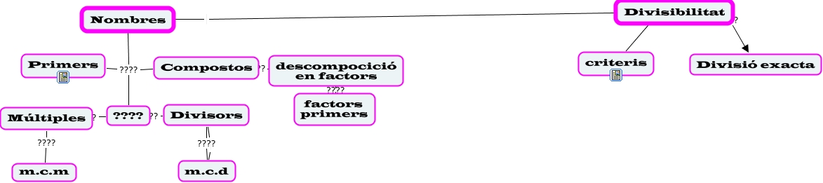 Aquest mapa conceptual conté informació relacionada amb: T2 Múltiples i divisors, Nombres ???? Primers, Divisibilitat ???? criteris, Divisibilitat ???? Divisió exacta, descompocició en factors ???? factors primers, ???? ???? Múltiples, Compostos ???? descompocició en factors, Nombres ???? Compostos, Múltiples ???? m.c.m, Nombres Divisibilitat, Nombres ???? ????, Divisors ???? m.c.d, ???? ???? Divisors, Divisors m.c.d