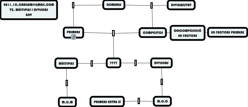 Aquest mapa conceptual conté informació relacionada amb: NOMBRES MATES, ???? MÚLTIPLES, ???? DIVISORS, NOMBRES PRIMERS, NOMBRES DIVISIBILITAT, COMPOSTOS EN FACTORS PRIMERS, MÚLTIPLES M.C.M, PRIMERS COMPOSTOS, DIVISORS M.C.D, PRIMERS ????, M.C.D PRIMERS ENTRE SÍ, NOMBRES COMPOSTOS