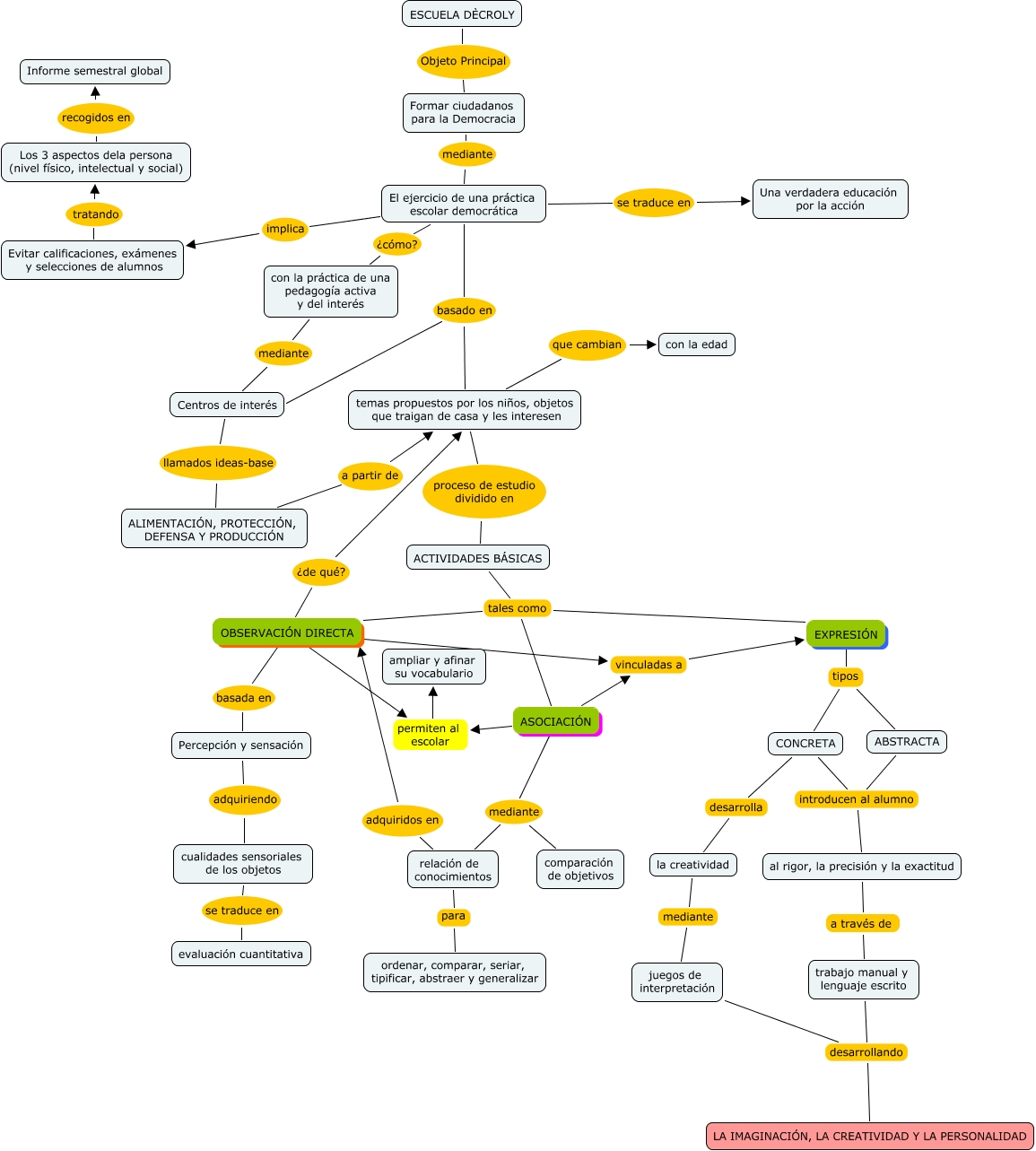 Este Cmap, tiene información relacionada con: Escuela Décroly, OBSERVACIÓN DIRECTA basada en Percepción y sensación, ACTIVIDADES BÁSICAS tales como ASOCIACIÓN, CONCRETA introducen al alumno al rigor, la precisión y la exactitud, Evitar calificaciones, exámenes y selecciones de alumnos tratando Los 3 aspectos dela persona (nivel físico, intelectual y social), El ejercicio de una práctica escolar democrática ¿cómo? con la práctica de una pedagogía activa y del interés, relación de conocimientos mediante comparación de objetivos, Centros de interés basado en temas propuestos por los niños, objetos que traigan de casa y les interesen, Los 3 aspectos dela persona (nivel físico, intelectual y social) recogidos en Informe semestral global, El ejercicio de una práctica escolar democrática implica Evitar calificaciones, exámenes y selecciones de alumnos, ABSTRACTA introducen al alumno al rigor, la precisión y la exactitud, al rigor, la precisión y la exactitud a través de trabajo manual y lenguaje escrito, ACTIVIDADES BÁSICAS tales como EXPRESIÓN, ACTIVIDADES BÁSICAS tales como OBSERVACIÓN DIRECTA, El ejercicio de una práctica escolar democrática basado en temas propuestos por los niños, objetos que traigan de casa y les interesen, relación de conocimientos adquiridos en OBSERVACIÓN DIRECTA, la creatividad mediante juegos de interpretación, relación de conocimientos para ordenar, comparar, seriar, tipificar, abstraer y generalizar, EXPRESIÓN tipos ABSTRACTA, ASOCIACIÓN mediante comparación de objetivos, temas propuestos por los niños, objetos que traigan de casa y les interesen proceso de estudio dividido en ACTIVIDADES BÁSICAS