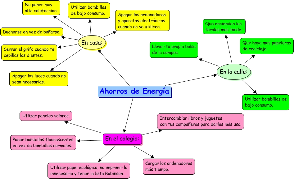 Este Cmap, tiene información relacionada con: Ahorros de Energía, En casa: Apagar los ordenadores y aparatos electrónicos cuando no se utilicen., En el colegio: Cargar los ordenadores más tiempo., En casa: No poner muy alta calefaccion., En casa: Cerrar el grifo cuando te cepillas los dientes., En el colegio: Intercambiar libros y juguetes con tus compañeros para darles más uso., En la calle: Que enciendan las farolas mas tarde., En la calle: Utilizar bombillas de bajo consumo., Ahorros de Energía En casa:, En el colegio: Utilizar papel ecológico, no imprimir lo innecesario y tener la lista Robinson., En casa: Ducharse en vez de bañarse., En el colegio: Utlizar paneles solares., Ahorros de Energía En la calle:, En casa: Utilizar bombillas de bajo consumo., En la calle: Que haya mas papeleras de reciclaje., En casa: Apagar las luces cuando no sean necesarias., Ahorros de Energía En el colegio:, En la calle: Llevar tu propia bolsa de la compra., En el colegio: Poner bombillas flourescentes en vez de bombillas normales.