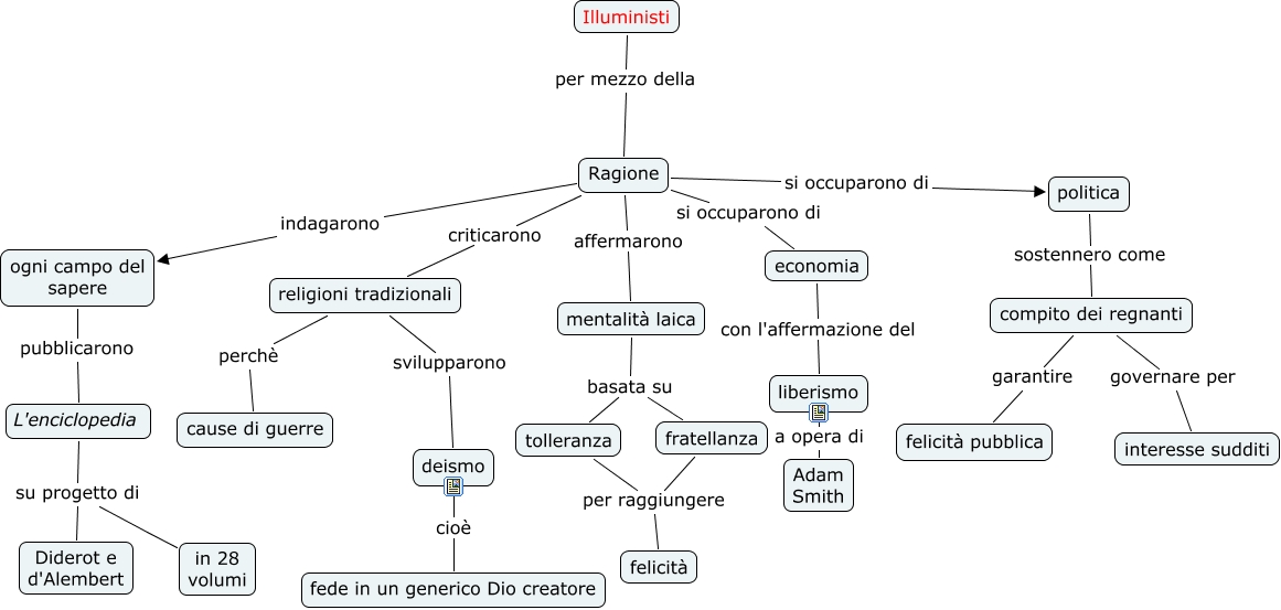 Questa Cmap, creata con IHMC CmapTools, contiene informazioni relative a: illuminismo, L'enciclopedia su progetto di in 28 volumi, liberismo a opera di Adam Smith, Ragione si occuparono di politica, mentalità laica basata su fratellanza, Illuministi per mezzo della Ragione, deismo cioè fede in un generico Dio creatore, fratellanza per raggiungere felicità, Ragione criticarono religioni tradizionali, mentalità laica basata su tolleranza, religioni tradizionali perchè cause di guerre, Ragione indagarono ogni campo del sapere, compito dei regnanti garantire felicità pubblica, Ragione affermarono mentalità laica, L'enciclopedia su progetto di Diderot e d'Alembert, politica sostennero come compito dei regnanti, Ragione si occuparono di economia, compito dei regnanti governare per interesse sudditi, religioni tradizionali svilupparono deismo, tolleranza per raggiungere felicità, ogni campo del sapere pubblicarono L'enciclopedia