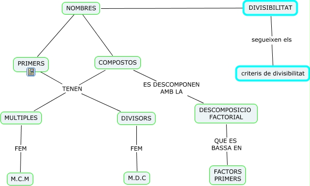 Aquest mapa conceptual conté informació relacionada amb: multiples i divisors, DIVISIBILITAT segueixen els criteris de divisibilitat, MULTIPLES FEM M.C.M, NOMBRES ???? COMPOSTOS, NOMBRES ???? PRIMERS, NOMBRES ???? DIVISIBILITAT, DESCOMPOSICIO FACTORIAL QUE ES BASSA EN FACTORS PRIMERS, DIVISORS FEM M.D.C, COMPOSTOS ES DESCOMPONEN AMB LA DESCOMPOSICIO FACTORIAL, COMPOSTOS TENEN MULTIPLES, ???? DIVISORS
