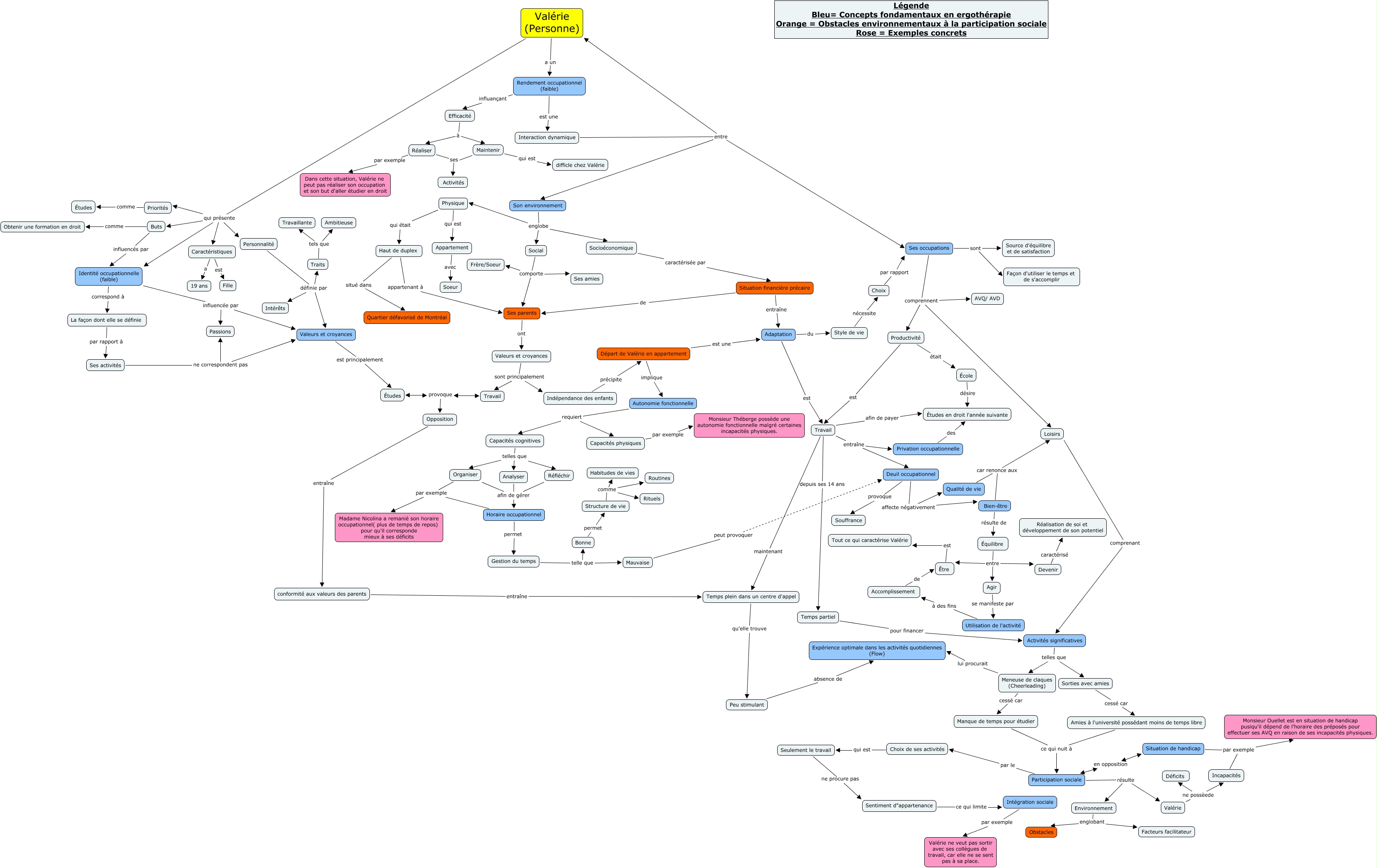 Cette carte de concepts créée avec IHMC CmapTools traite de: BertrandKim_LemboCorrado_Ménard-C.Sasha_ValléeKevin_TravailFinalERT1400, Caractéristiques a 19 ans, Travail provoque Opposition, Horaire occupationnel par exemple Madame Nicolina a remanié son horaire occupationnel( plus de temps de repos) pour qu'il corresponde mieux à ses déficits, Temps partiel pour financer Activités significatives, Départ de Valérie en appartement est une Adaptation, Autonomie fonctionnelle requiert Capacités cognitives, Adaptation du Style de vie, Physique qui est Appartement, Ses occupations sont Source d'équilibre et de satisfaction, École désire Études en droit l'année suivante, Choix de ses activités qui est Seulement le travail, Équilibre entre Être, Rendement occupationnel (faible) influançant Efficacité, Équilibre entre Agir, Autonomie fonctionnelle requiert Capacités physiques, Travail entraîne Deuil occupationnel, Situation financière précaire de Ses parents, Analyser afin de gérer Horaire occupationnel, Valérie (Personne) qui présente Identité occupationnelle (faible), Gestion du temps telle que Bonne