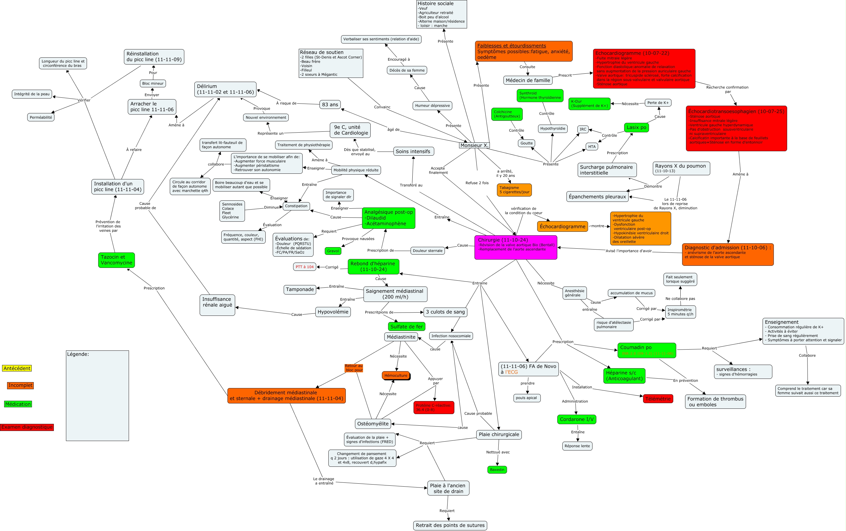 Cette carte de concepts créée avec IHMC CmapTools traite de: M. x, Plaie chirurgicale Cause probable Infection nosocomiale, Réinstallation du picc line (11-11-09) Vérifier Perméabilité, Chirurgie (11-10-24) -Révision de la valve aortique Bio (Bentall) -Remplacement de l'aorte ascendante Entraîne Infection nosocomiale, Infection nosocomiale cause Médiastinite, Chirurgie (11-10-24) -Révision de la valve aortique Bio (Bentall) -Remplacement de l'aorte ascendante Entraîne Plaie chirurgicale, Monsieur X. Présente IRC, Lasix po Contrôle IRC, Monsieur X. Présente Hypothyroïdie, Monsieur X. Accepte finalement Chirurgie (11-10-24) -Révision de la valve aortique Bio (Bentall) -Remplacement de l'aorte ascendante, Nouvel environnement Provoque Délirium (11-11-02 et 11-11-06), Chirurgie (11-10-24) -Révision de la valve aortique Bio (Bentall) -Remplacement de l'aorte ascendante Entraîne Mobilité physique réduite, Cordarone I/V Entaîne Réponse lente, Plaie à l'ancien site de drain Requiert Changement de pansement q 2 jours : utilisation de gaze 4 X 4 et 4x8, recouvert d,hypafix, Chirurgie (11-10-24) -Révision de la valve aortique Bio (Bentall) -Remplacement de l'aorte ascendante vérification de la condition du coeur Échocardiogramme, Saignement médiastinal (200 ml/h) Prescritpions de 3 culots de sang, Délirium (11-11-02 et 11-11-06) Amène à Arracher le picc line 11-11-06, Réinstallation du picc line (11-11-09) Vérifier Longueur du picc line et circonférence du bras, Enseignement - Consommation régulière de K+ - Activités à éviter - Prise de sang régulièrement - Symptômes à porter attention et signaler Collabore Comprend le traitement car sa femme suivait aussi ce traitement, Monsieur X. âgé de 83 ans, Héparine s/c (Anticoagulant) En prévention Formation de thrombus ou emboles