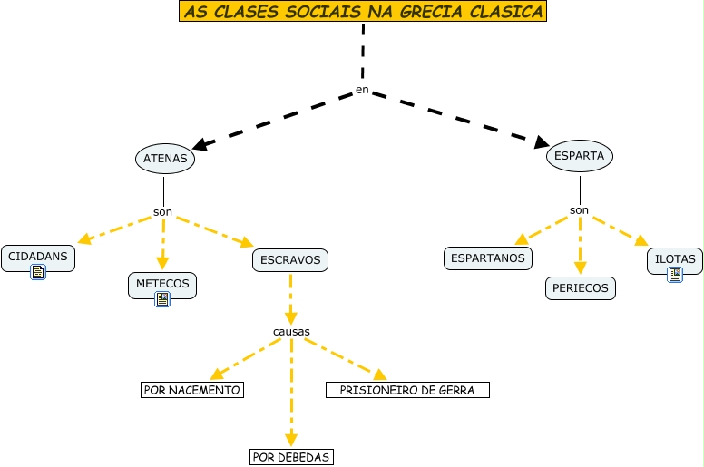 Este mapa conceptual ten información relativa a: clases sociais, ATENAS son METECOS, ESPARTA son ILOTAS, AS CLASES SOCIAIS NA GRECIA CLASICA en ATENAS, ESPARTA son ESPARTANOS, ATENAS son ESCRAVOS, ATENAS son CIDADANS, ESCRAVOS causas PRISIONEIRO DE GERRA, ESPARTA son PERIECOS, AS CLASES SOCIAIS NA GRECIA CLASICA en ESPARTA, ESCRAVOS causas POR NACEMENTO, ESCRAVOS causas POR DEBEDAS