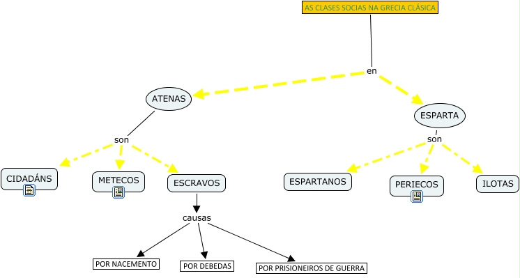 Este mapa conceptual ten información relativa a: clases socias, ESCRAVOS causas POR NACEMENTO, ESPARTA son ILOTAS, ESCRAVOS causas POR PRISIONEIROS DE GUERRA, ESPARTA son PERIECOS, ATENAS son CIDADÁNS, AS CLASES SOCIAS NA GRECIA CLÁSICA en ESPARTA, ATENAS son ESCRAVOS, AS CLASES SOCIAS NA GRECIA CLÁSICA en ATENAS, ESCRAVOS causas POR DEBEDAS, ATENAS son METECOS, ESPARTA son ESPARTANOS