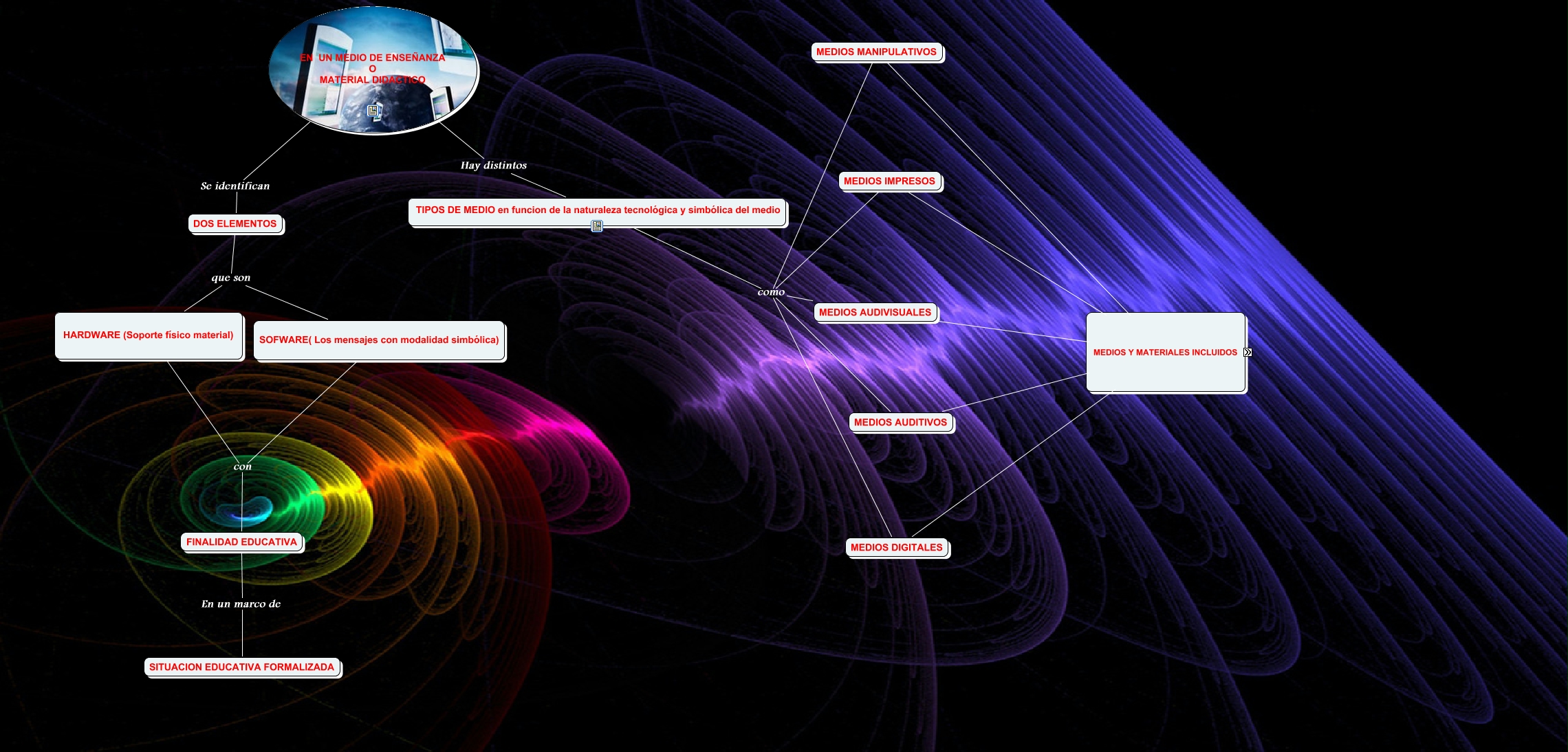 Este Cmap, tiene información relacionada con: Medios de Enseñanza, MEDIOS AUDITIVOS emplean sonido el cassette, MEDIOS AUDIVISUALES emplean sonidos e imagenes medios de imagen fija, FINALIDAD EDUCATIVA con HARDWARE (Soporte físico material), TIPOS DE MEDIO en funcion de la naturaleza tecnológica y simbólica del medio Hay distintos EN UN MEDIO DE ENSEÑANZA O MATERIAL DIDACTICO, MEDIOS AUDIVISUALES emplean sonidos e imagenes medios de imagen en movimiento, SOFWARE( Los mensajes con modalidad simbólica) que son HARDWARE (Soporte físico material), MEDIOS DIGITALES como TIPOS DE MEDIO en funcion de la naturaleza tecnológica y simbólica del medio, MEDIOS DIGITALES combinacion de simbolos de la información ordenador personal, MEDIOS MANIPULATIVOS usan medios manipulativos simbolicos, FINALIDAD EDUCATIVA con SOFWARE( Los mensajes con modalidad simbólica), MEDIOS MANIPULATIVOS usan objetos y recursos reales, MEDIOS AUDIVISUALES como TIPOS DE MEDIO en funcion de la naturaleza tecnológica y simbólica del medio, DOS ELEMENTOS Se identifican EN UN MEDIO DE ENSEÑANZA O MATERIAL DIDACTICO, SOFWARE( Los mensajes con modalidad simbólica) que son DOS ELEMENTOS, MEDIOS IMPRESOS como TIPOS DE MEDIO en funcion de la naturaleza tecnológica y simbólica del medio, MEDIOS IMPRESOS emplean codigos verbales material orientado al alumno, MEDIOS AUDITIVOS emplean sonido la radio, MEDIOS AUDITIVOS como TIPOS DE MEDIO en funcion de la naturaleza tecnológica y simbólica del medio, MEDIOS MANIPULATIVOS como TIPOS DE MEDIO en funcion de la naturaleza tecnológica y simbólica del medio, MEDIOS DIGITALES combinacion de simbolos de la información discos opticos