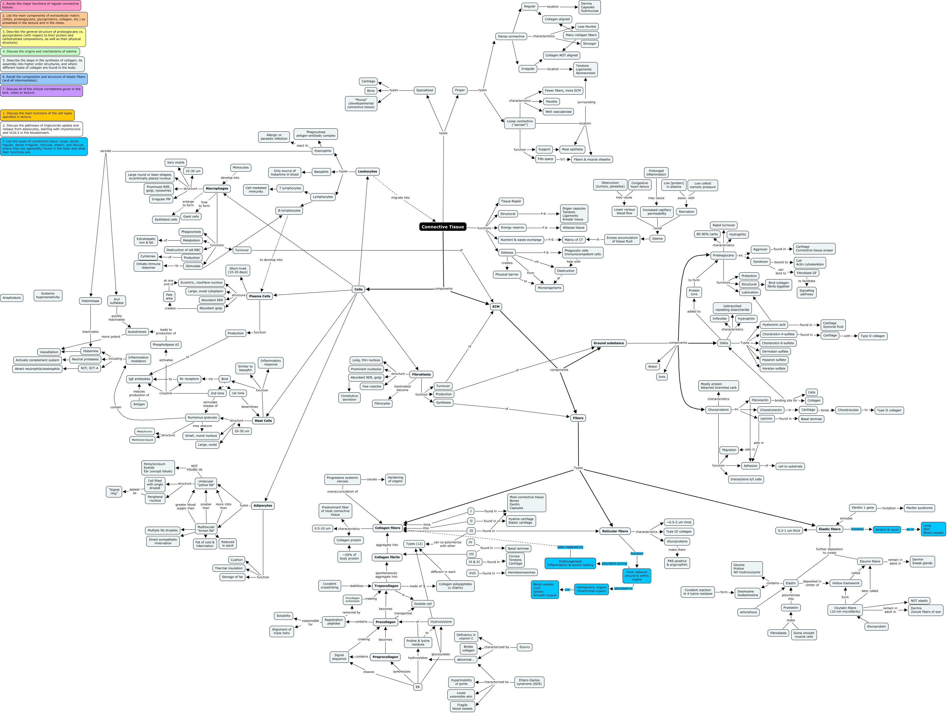 This Concept Map, created with IHMC CmapTools, has information related to: CS45 - Connective Tissue - ECM, Cells Plasma Cells, I thick Collagen fibers, Defense from Microorganisms, Plasma Cells structure Abundant RER, Chondrocytes to Type II collagen, Cell filled with single droplet appear as "Signet ring", Ground substance components Proteoglycans, Ehlers-Danlos syndrome (EDS) characterized by Hypermobility of joints, II thin Collagen fibers, Leukocytes types Lymphocytes, Eosinophils secrete Aryl sulfatase, Collagen fibers characteristics Collagen protein, Leukocytes types Eosinophils, Inflammation mediators including NCF, ECT-A, Regular location Dermis Capsules Submucosa, 2nd time crosslink IgE antibodies, Mast Cells function Similar to basophil, Mast Cells structure Small, round nucleus, Multilocular "brown fat" Reduced in adult, Eosinophils Phagocytose antigen-antibody complex