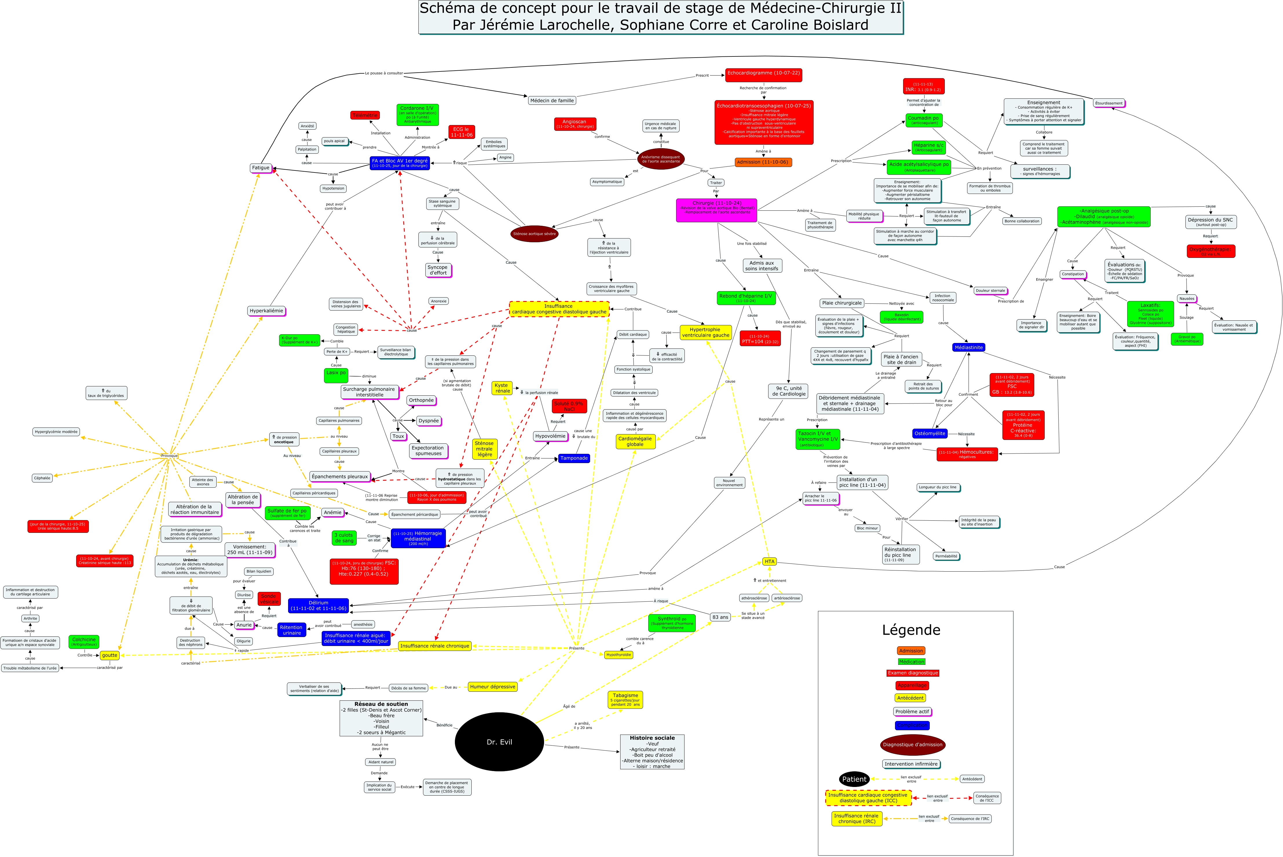 Cette carte de concepts créée avec IHMC CmapTools traite de: Dr. Evil le Vrai, Insuffisance rénale aiguë: débit urinaire < 400ml/jour ⇑ rapide ⇓ de débit de filtration glomérulaire, Plaie chirurgicale Requiert Changement de pansement q 2 jours :utilisation de gaze 4X4 et 4x8, recouvert d'hypafix, Chirurgie (11-10-24) -Révision de la valve aortique Bio (Bentall) -Remplacement de l'aorte ascendante cause Rebond d'héparine I/V (11-10-24), Croissance des myofibres ventriculaire gauche Cause Hypertrophie ventriculaire gauche, Anévrisme dissequant de l'aorte ascendante constitue Urgence médicale en cas de rupture, athérosclérose ⇑ et entretiennent HTA, Perte de K+ Requiert Surveillance bilan électrolytique, Insuffisance cardiaque congestive diastolique gauche cause Distension des veines jugulaires, (11-10-25) Hémorragie médiastinal (200 ml/h) Entraîne Tamponade, Fonction systolique ⇓ Débit cardiaque, Constipation Requiert Enseignement: Boire beaucoup d'eau et se mobiliser autant que possible, Installation d'un picc line (11-11-04) Vérifier Intégrité de la peau au site d'insertion, (11-11-04) Hémocultures: négatives Prescription d'antibiothérapie à large spectre Tazocin I/V et Vancomycine I/V (antibiotique), Urémie: Accumulation de déchets métabolique (urée, créatinine, déchets azotés, eau, électrolytes) Provoque Fatigue, Urémie: Accumulation de déchets métabolique (urée, créatinine, déchets azotés, eau, électrolytes) Provoque Hyperglycémie modérée, Insuffisance cardiaque congestive diastolique gauche cause Congestion hépatique, ⇑ de la résistance à l'éjection ventriculaire ⇑ Croissance des myofibres ventriculaire gauche, -Analgésique post-op -Dilaudid (analgésique opioïde) -Acétaminophène (analgésique non-opioïde) Provoque Nausées, Anévrisme dissequant de l'aorte ascendante est Asymptomatique, ⇑ de pression oncotique Au niveau Capillaires péricardiques