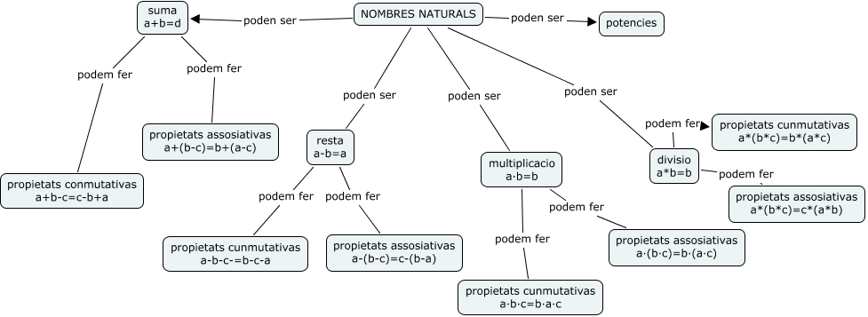 Aquest mapa conceptual conté informació relacionada amb: nombres naturals, resta a-b=a podem fer propietats assosiativas a-(b-c)=c-(b-a), multiplicacio a·b=b podem fer propietats assosiativas a·(b·c)=b·(a·c), NOMBRES NATURALS poden ser multiplicacio a·b=b, NOMBRES NATURALS poden ser suma a+b=d, NOMBRES NATURALS poden ser divisio a*b=b, NOMBRES NATURALS poden ser potencies, divisio a*b=b podem fer propietats assosiativas a*(b*c)=c*(a*b), suma a+b=d podem fer propietats conmutativas a+b-c=c-b+a, multiplicacio a·b=b podem fer propietats cunmutativas a·b·c=b·a·c, NOMBRES NATURALS poden ser resta a-b=a, suma a+b=d podem fer propietats assosiativas a+(b-c)=b+(a-c), divisio a*b=b podem fer propietats cunmutativas a*(b*c)=b*(a*c), resta a-b=a podem fer propietats cunmutativas a-b-c-=b-c-a