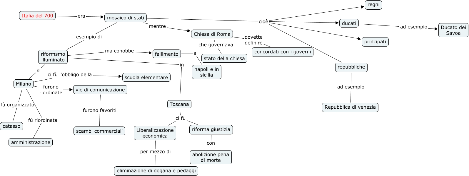 Questa Cmap, creata con IHMC CmapTools, contiene informazioni relative a: Italia del 700 2, mosaico di stati cioè ducati, mosaico di stati mentre Chiesa di Roma, mosaico di stati cioè principati, ducati ad esempio Ducato dei Savoa, mosaico di stati esempio di riformsmo illuminato, fallimento a napoli e in sicilia, Italia del 700 era mosaico di stati, Chiesa di Roma che governava stato della chiesa, mosaico di stati cioè regni, Milano furono riordinate vie di comunicazione, Milano fù riordinata amministrazione, Toscana ci fù Liberalizzazione economica, repubbliche ad esempio Repubblica di venezia, Milano ci fù l'obbligo della scuola elementare, Liberalizzazione economica per mezzo di eliminazione di dogana e pedaggi, riformsmo illuminato in Toscana, vie di comunicazione furono favoriti scambi commerciali, riformsmo illuminato ma conobbe fallimento, riformsmo illuminato a Milano, Chiesa di Roma dovette definire concordati con i governi