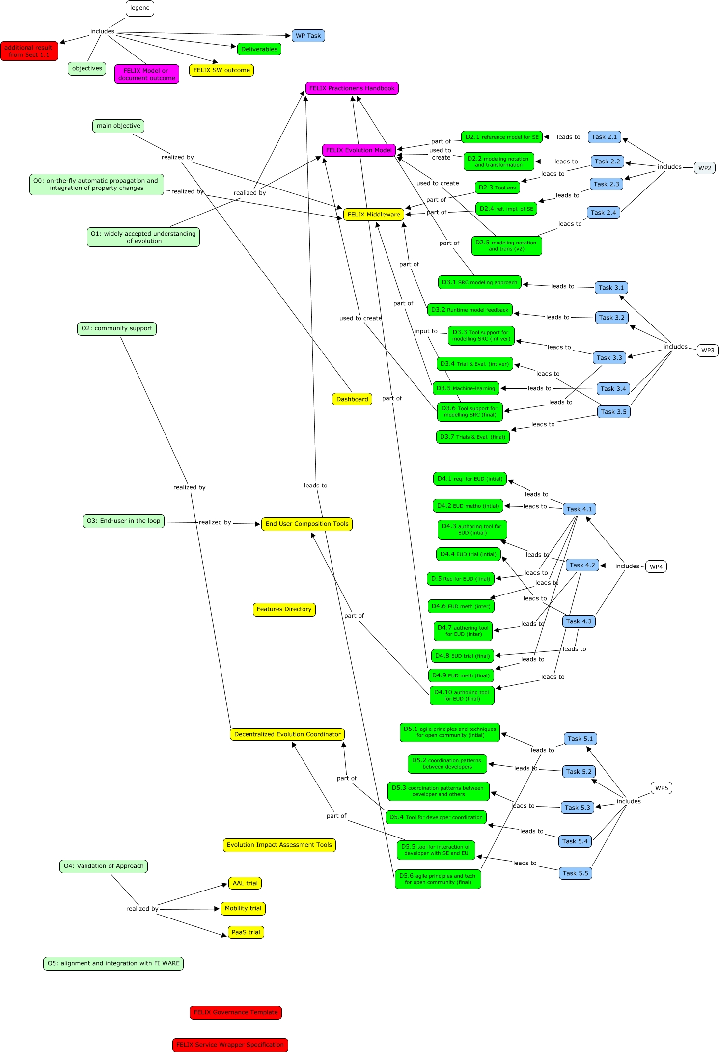 This Concept Map, created with IHMC CmapTools, has information related to: Results vs WPs vs Objectives, D3.6 Tool support for modelling SRC (final) used to create FELIX Evolution Model, D2.3 Tool env part of FELIX Middleware, WP3 includes Task 3.3, Task 3.5 leads to D3.7 Trials & Eval. (final), D4.10 authoring tool for EUD (final) part of End User Composition Tools, Task 3.3 leads to D3.6 Tool support for modelling SRC (final), Task 4.1 leads to D.5 Req for EUD (final), O3: End-user in the loop realized by End User Composition Tools, D2.2 modeling notation and transformation used to create FELIX Evolution Model, Task 4.1 leads to D4.2 EUD metho (intial), D2.1 reference model for SE part of FELIX Evolution Model, O2: community support realized by Decentralized Evolution Coordinator, D3.5 Machine-learning part of FELIX Middleware, Task 3.4 leads to D3.5 Machine-learning, Task 4.3 leads to D4.8 EUD trial (final), O4: Validation of Approach realized by Mobility trial, D5.6 agile principles and tech for open community (final) leads to FELIX Practioner's Handbook, Task 5.4 leads to D5.4 Tool for developer coordination, legend includes FELIX SW outcome, Task 4.1 leads to D4.9 EUD meth (final)