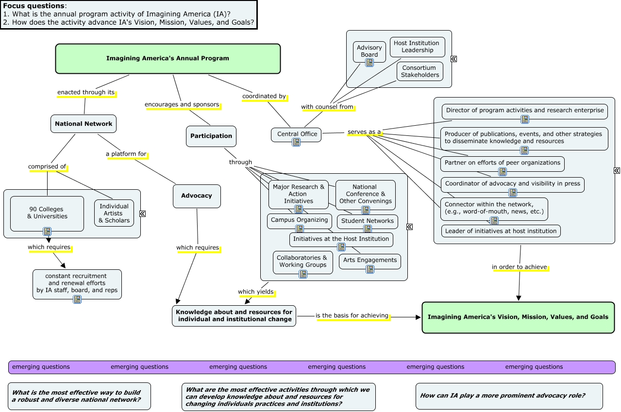 This Concept Map, created with IHMC CmapTools, has information related to: IA Program Activity Map for Strategy Committee (Dec. 2011), Imagining America's Annual Program enacted through its National Network, Central Office with counsel from Host Institution Leadership, Central Office serves as a Coordinator of advocacy and visibility in press, Central Office serves as a Producer of publications, events, and other strategies to disseminate knowledge and resources, Central Office serves as a Director of program activities and research enterprise, Activities which yields Knowledge about and resources for individual and institutional change, Participation through Student Networks, Imagining America's Annual Program encourages and sponsors Participation, Participation through Major Research & Action Initiatives, Knowledge about and resources for individual and institutional change is the basis for achieving Imagining America's Vision, Mission, Values, and Goals, Participation through Arts Engagements, Advocacy which requires Knowledge about and resources for individual and institutional change, 90 Colleges & Universities which requires constant recruitment and renewal efforts by IA staff, board, and reps, National Network a platform for Advocacy, Imagining America's Annual Program coordinated by Central Office, Roles in order to achieve Imagining America's Vision, Mission, Values, and Goals, Central Office serves as a Leader of initiatives at host institution, National Network comprised of Individual Artists & Scholars, Central Office serves as a Connector within the network, (e.g., word-of-mouth, news, etc.), Central Office with counsel from Consortium Stakeholders