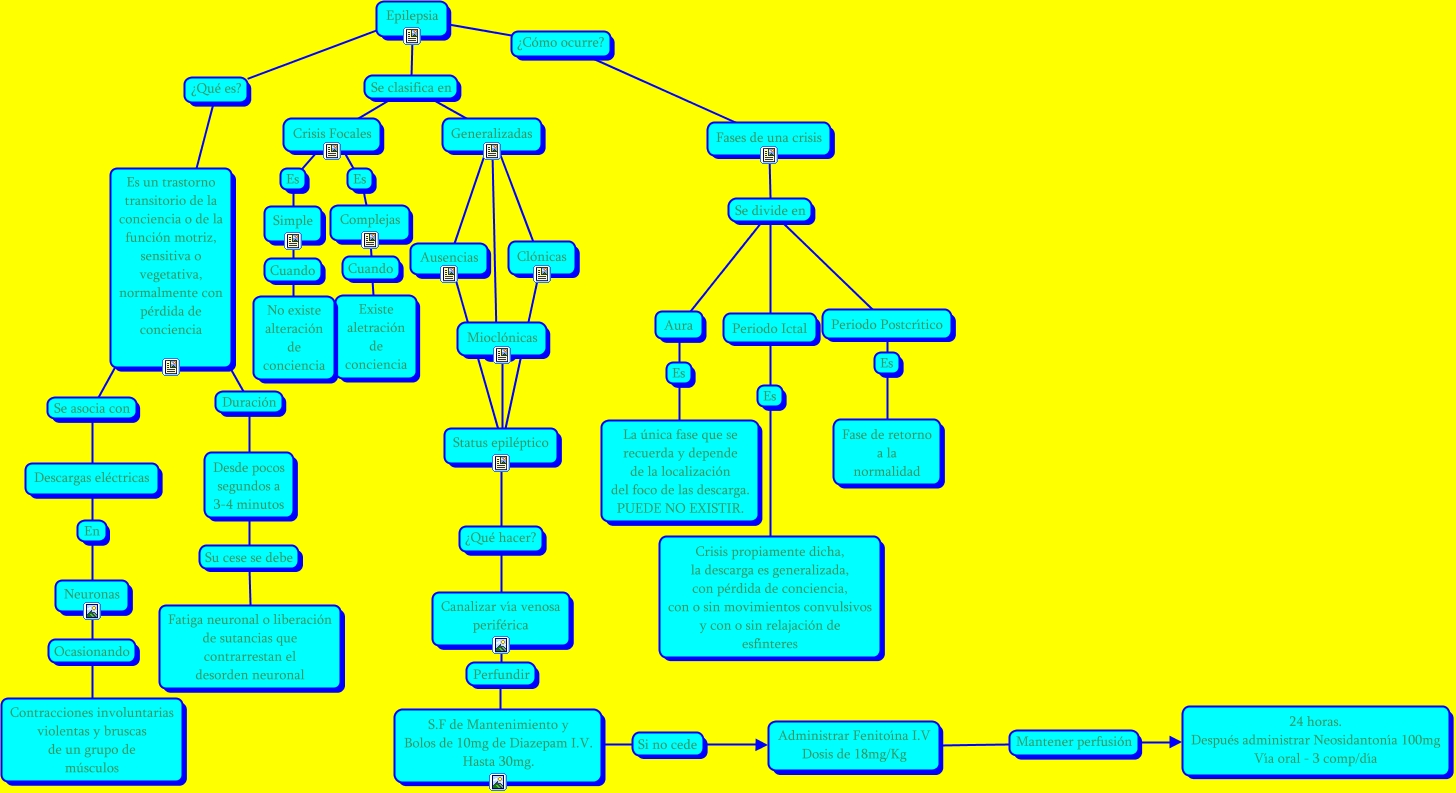 Este Cmap, tiene información relacionada con: Epilepsia Mapa, Canalizar vía venosa periférica Perfundir S.F de Mantenimiento y Bolos de 10mg de Diazepam I.V. Hasta 30mg., Desde pocos segundos a 3-4 minutos Su cese se debe Fatiga neuronal o liberación de sutancias que contrarrestan el desorden neuronal, Status epiléptico ¿Qué hacer? Canalizar vía venosa periférica, Complejas Cuando Existe aletración de conciencia, Neuronas Ocasionando Contracciones involuntarias violentas y bruscas de un grupo de músculos, Epilepsia ¿Qué es? Es un trastorno transitorio de la conciencia o de la función motriz, sensitiva o vegetativa, normalmente con pérdida de conciencia, Mioclónicas ???? Status epiléptico, Epilepsia Se clasifica en Crisis Focales, Aura Es La única fase que se recuerda y depende de la localización del foco de las descarga. PUEDE NO EXISTIR., Fases de una crisis Se divide en Aura, Administrar Fenitoína I.V Dosis de 18mg/Kg Mantener perfusión 24 horas. Después administrar Neosidantonía 100mg Vía oral - 3 comp/día, Fases de una crisis Se divide en Periodo Ictal, Clónicas ???? Status epiléptico, Fases de una crisis Se divide en Periodo Postcrítico, Descargas eléctricas En Neuronas, Es un trastorno transitorio de la conciencia o de la función motriz, sensitiva o vegetativa, normalmente con pérdida de conciencia Se asocia con Descargas eléctricas, Ausencias ???? Status epiléptico, Generalizadas ???? Ausencias, S.F de Mantenimiento y Bolos de 10mg de Diazepam I.V. Hasta 30mg. Si no cede Administrar Fenitoína I.V Dosis de 18mg/Kg, Periodo Ictal Es Crisis propiamente dicha, la descarga es generalizada, con pérdida de conciencia, con o sin movimientos convulsivos y con o sin relajación de esfínteres