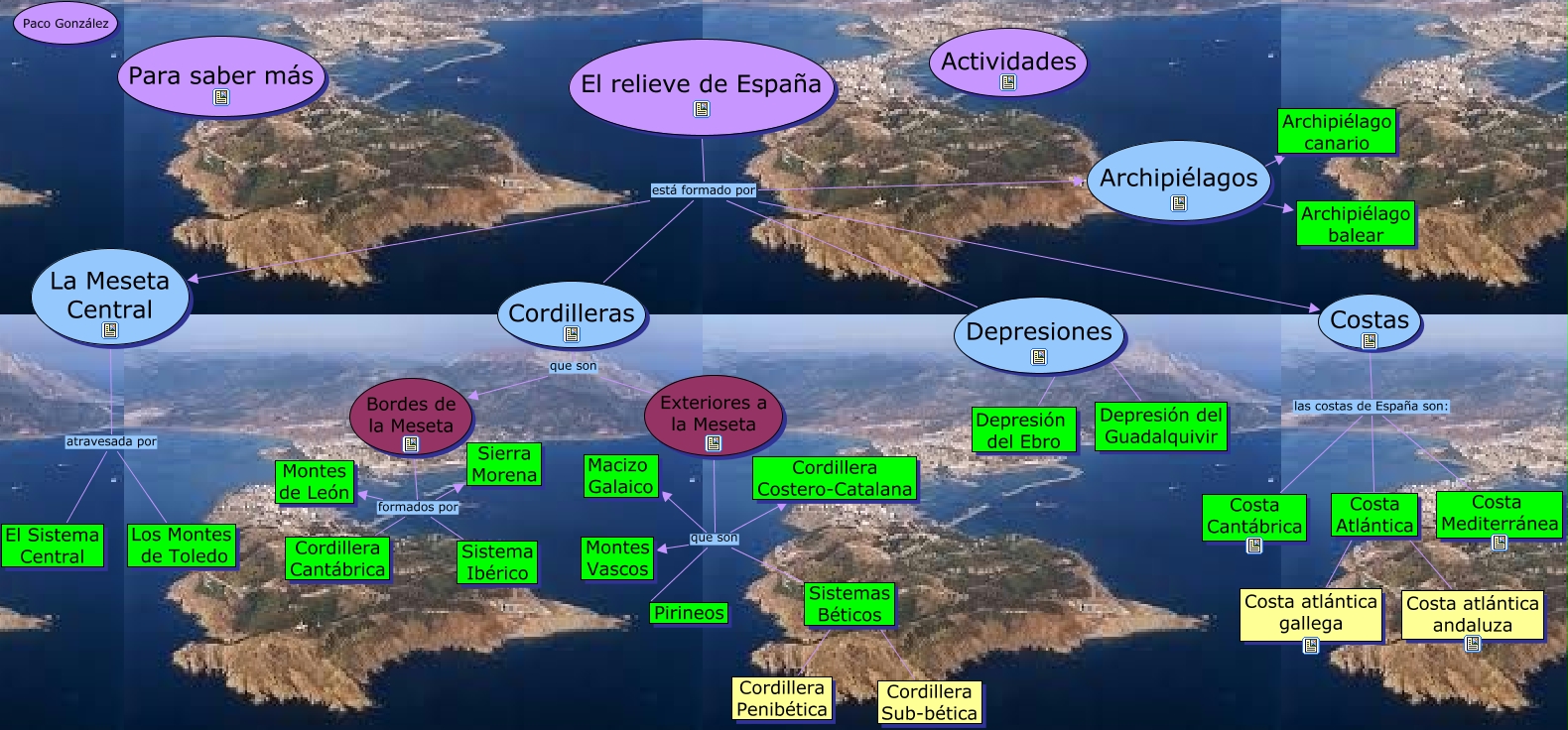 Este Cmap, tiene información relacionada con: El relieve de España, Archipiélagos ???? Archipiélago canario, Sistemas Béticos ???? Cordillera Penibética, La Meseta Central atravesada por El Sistema Central, Bordes de la Meseta formados por Montes de León, El relieve de España está formado por Costas, El relieve de España está formado por Depresiones, Exteriores a la Meseta que son Macizo Galaico, La Meseta Central atravesada por Los Montes de Toledo, El relieve de España está formado por Archipiélagos, El relieve de España está formado por Cordilleras, Sistemas Béticos ???? Cordillera Sub-bética, Costas las costas de España son: Costa Mediterránea, Cordilleras que son Exteriores a la Meseta, Costas las costas de España son: Costa Cantábrica, Bordes de la Meseta formados por Cordillera Cantábrica, Exteriores a la Meseta que son Sistemas Béticos, Costa Atlántica ???? Costa atlántica gallega, Cordilleras que son Bordes de la Meseta, Exteriores a la Meseta que son Cordillera Costero-Catalana, Bordes de la Meseta formados por Sistema Ibérico