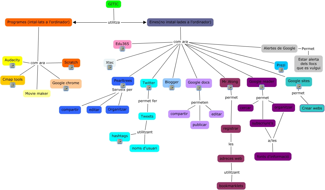 Este Cmap, tiene información relacionada con: GITIC, Eines(no instal·lades a l'ordinador) com ara Xtec, Prezi com ara Google sites, Eines(no instal·lades a l'ordinador) com ara Alertes de Google, Google reader com ara Blogger, fonts d'informació a/les subscriure's, Google docs com ara Blogger, Twitter com ara Google sites, Twitter com ara Xtec, Tweets permet fer Twitter, publicar permeten Google docs, Alertes de Google Permet Estar alerta dels llocs que es vulgui, GITIC utilitza Programes (intal·lats a l'ordinador), Prezi com ara Pearltrees, Programes (intal·lats a l'ordinador) com ara Scratch, Audacity com ara Scratch, Mr.Wong com ara Edu365, Programes (intal·lats a l'ordinador) com ara Cmap tools, Google reader com ara Pearltrees, Twitter com ara Edu365, Mr.Wong com ara Alertes de Google