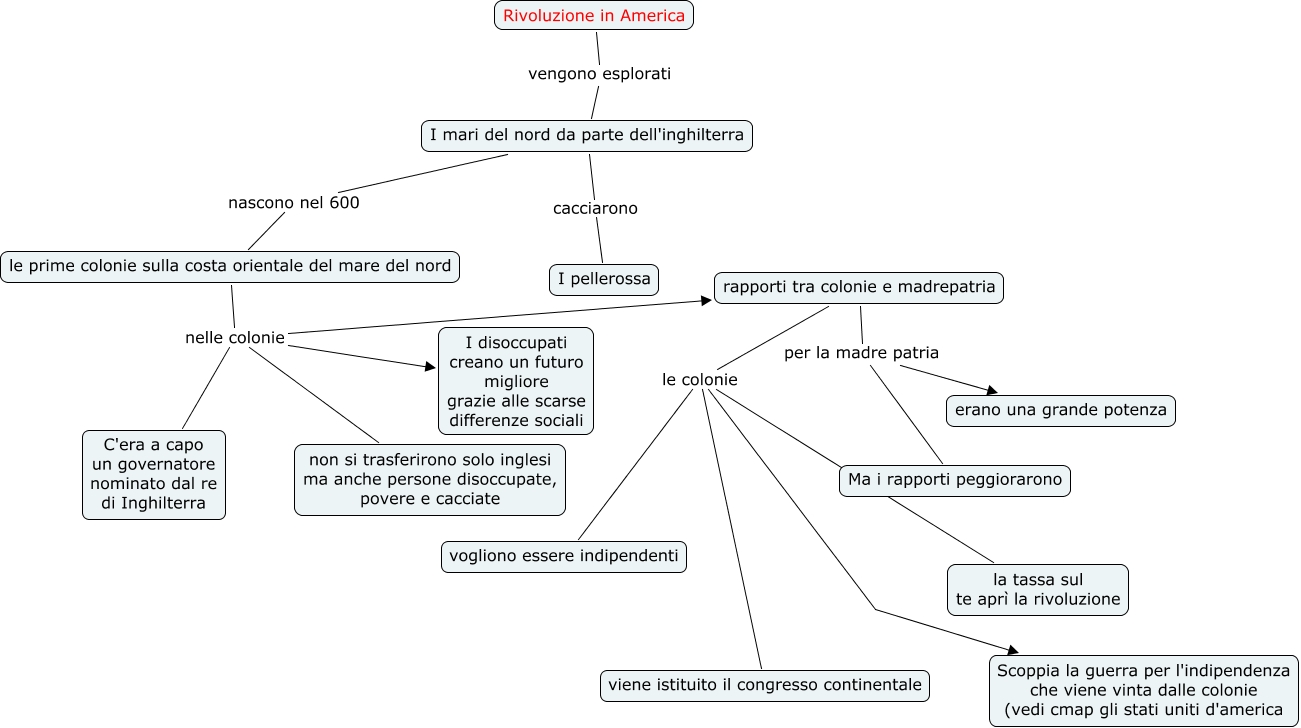 Questa Cmap, creata con IHMC CmapTools, contiene informazioni relative a: rivol americ, rapporti tra colonie e madrepatria per la madre patria Ma i rapporti peggiorarono, rapporti tra colonie e madrepatria le colonie la tassa sul te aprì la rivoluzione, le prime colonie sulla costa orientale del mare del nord nelle colonie rapporti tra colonie e madrepatria, rapporti tra colonie e madrepatria le colonie vogliono essere indipendenti, le prime colonie sulla costa orientale del mare del nord nelle colonie non si trasferirono solo inglesi ma anche persone disoccupate, povere e cacciate, I mari del nord da parte dell'inghilterra cacciarono I pellerossa, le prime colonie sulla costa orientale del mare del nord nelle colonie C'era a capo un governatore nominato dal re di Inghilterra, rapporti tra colonie e madrepatria le colonie Scoppia la guerra per l'indipendenza che viene vinta dalle colonie (vedi cmap gli stati uniti d'america, Rivoluzione in America vengono esplorati I mari del nord da parte dell'inghilterra, I mari del nord da parte dell'inghilterra nascono nel 600 le prime colonie sulla costa orientale del mare del nord, le prime colonie sulla costa orientale del mare del nord nelle colonie I disoccupati creano un futuro migliore grazie alle scarse differenze sociali, rapporti tra colonie e madrepatria per la madre patria erano una grande potenza, rapporti tra colonie e madrepatria le colonie viene istituito il congresso continentale