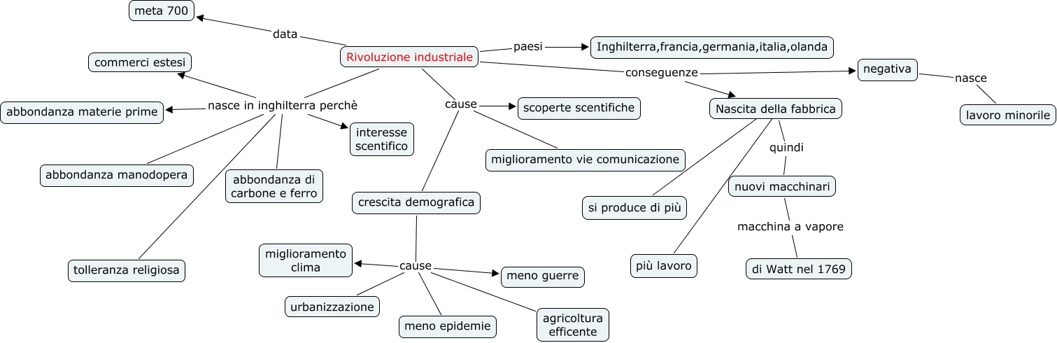 Questa Cmap, creata con IHMC CmapTools, contiene informazioni relative a: prima rivol.industriale(scuola), Rivoluzione industriale nasce in inghilterra perchè abbondanza materie prime, Rivoluzione industriale nasce in inghilterra perchè commerci estesi, nuovi macchinari macchina a vapore di Watt nel 1769, Rivoluzione industriale paesi Inghilterra,francia,germania,italia,olanda, negativa nasce lavoro minorile, crescita demografica cause agricoltura efficente, crescita demografica cause urbanizzazione, Rivoluzione industriale nasce in inghilterra perchè abbondanza manodopera, crescita demografica cause meno epidemie, crescita demografica cause miglioramento clima, Rivoluzione industriale conseguenze negativa, Rivoluzione industriale cause scoperte scentifiche, Rivoluzione industriale conseguenze Nascita della fabbrica, Nascita della fabbrica ???? si produce di più, crescita demografica cause meno guerre, Rivoluzione industriale data meta 700, Rivoluzione industriale cause miglioramento vie comunicazione, Rivoluzione industriale nasce in inghilterra perchè interesse scentifico, Rivoluzione industriale nasce in inghilterra perchè tolleranza religiosa, Rivoluzione industriale nasce in inghilterra perchè abbondanza di carbone e ferro