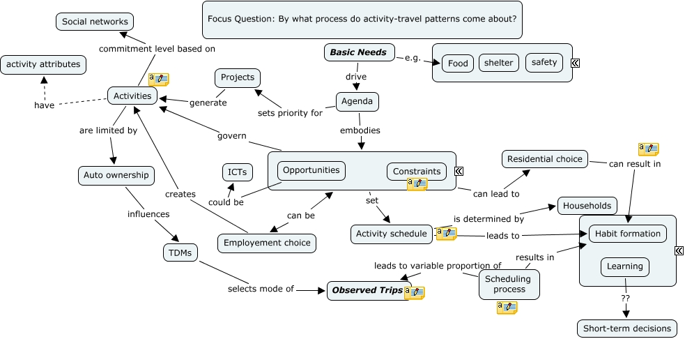 This Concept Map, created with IHMC CmapTools, has information related to: Activity-Travel_Behaviour_Jan 17, Employement choice creates Activities, Agenda sets priority for Projects, Activities have activity attributes, Basic Needs drive Agenda, TDMs selects mode of Observed Trips, Activity schedule is determined by Households, Learning ?? Short-term decisions, Activity schedule leads to Habit formation, ???? can lead to Residential choice, ???? govern Activities, Projects generate Activities, Basic Needs e.g. Food, Activities are limited by Auto ownership, Residential choice can result in Habit formation, Opportunities could be ICTs, Agenda embodies ????, Activities commitment level based on Social networks, ???? set Activity schedule, Scheduling process leads to variable proportion of Observed Trips, Scheduling process results in Habit formation