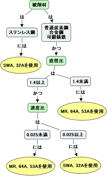 This Concept Map, created with IHMC CmapTools, has information related to: 砥材のルール, 普通炭素鋼 合金鋼 可鍛鋳鉄 かつ 直径比, 速度比 は 0.025未満, 1.4以上 かつ 速度比, ステンレス鋼 には SWA, 32Aを使用, 被削材 は ステンレス鋼, 被削材 は 普通炭素鋼 合金鋼 可鍛鋳鉄, 0.025未満 には MR, 64A, 53Aを使用, 直径比 は 1.4未満, 1.4未満 には MR, 64A, 53Aを使用, 直径比 は 1.4以上, 0.025以上 には SWA, 32Aを使用, 0.025以上 は 0.025未満