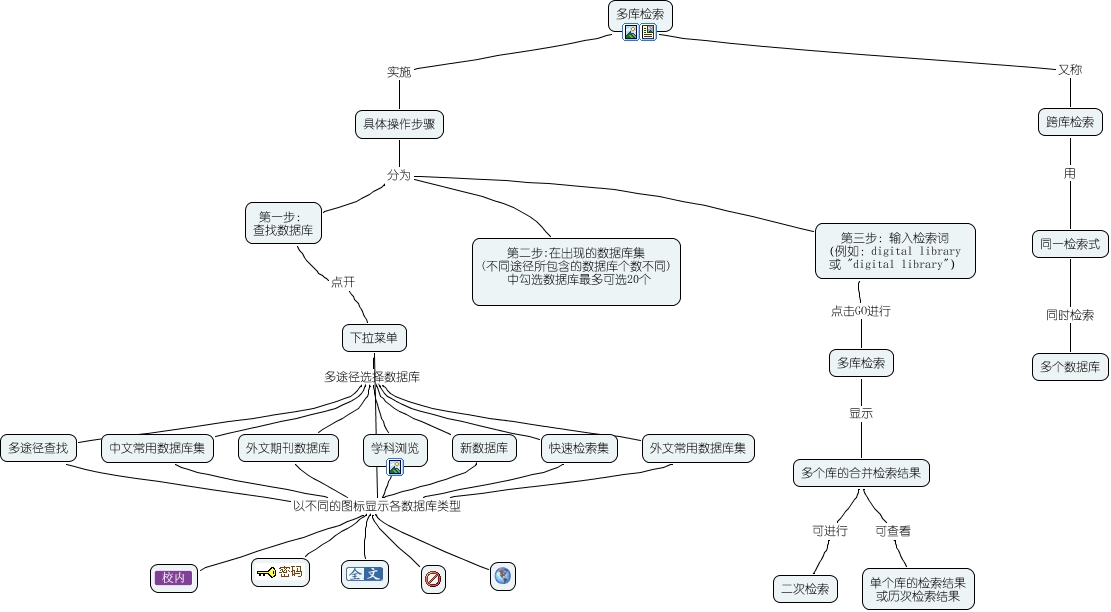 此概念图以 IHMC CmapTools 创建, 内含信息有关于: 跨库检索模型, 学科浏览 以不同的图标显示各数据库类型, 学科浏览 以不同的图标显示各数据库类型, 具体操作步骤 分为 第三步:输入检索词 (例如:digital library 或 "digital library"), 新数据库 以不同的图标显示各数据库类型, 多途径查找 以不同的图标显示各数据库类型 下拉菜单, 下拉菜单 多途径选择数据库 快速检索集, 新数据库 以不同的图标显示各数据库类型, 下拉菜单 多途径选择数据库 外文期刊数据库, 新数据库 以不同的图标显示各数据库类型, 中文常用数据库集 以不同的图标显示各数据库类型, 多途径查找 以不同的图标显示各数据库类型, 外文期刊数据库 以不同的图标显示各数据库类型, 学科浏览 以不同的图标显示各数据库类型, 多途径查找 以不同的图标显示各数据库类型, 下拉菜单 多途径选择数据库 多途径查找, 多库检索 显示 多个库的合并检索结果, 下拉菜单 多途径选择数据库 外文常用数据库集, 外文期刊数据库 以不同的图标显示各数据库类型, 外文常用数据库集 以不同的图标显示各数据库类型, 快速检索集 以不同的图标显示各数据库类型