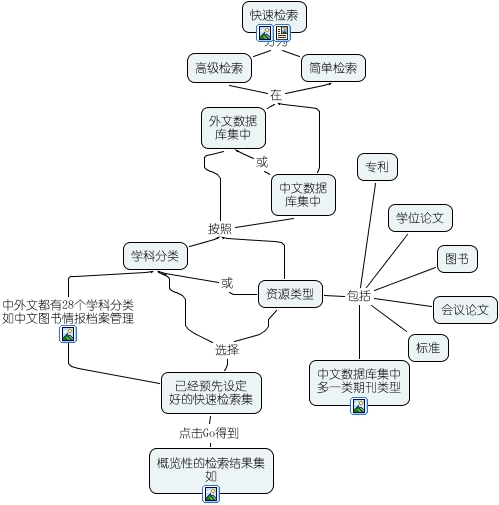 此概念图以 IHMC CmapTools 创建, 内含信息有关于: 快速检索模型, 中文数据 库集中 按照 资源类型, 资源类型 包括 中文数据库集中 多一类期刊类型, 外文数据 库集中 按照 学科分类, 快速检索 分为 高级检索, 学科分类 中外文都有28个学科分类 如中文图书情报档案管理 已经预先设定 好的快速检索集, 资源类型 包括 图书, 简单检索 在 中文数据 库集中, 资源类型 包括 会议论文, 学科分类 或 资源类型, 资源类型 选择 已经预先设定 好的快速检索集, 资源类型 包括 专利, 外文数据 库集中 或 中文数据 库集中, 高级检索 在 中文数据 库集中, 中文数据 库集中 按照 学科分类, 快速检索 分为 简单检索, 简单检索 在 外文数据 库集中, 资源类型 包括 学位论文, 资源类型 包括 标准, 学科分类 选择 已经预先设定 好的快速检索集, 已经预先设定 好的快速检索集 点击Go得到 概览性的检索结果集 如