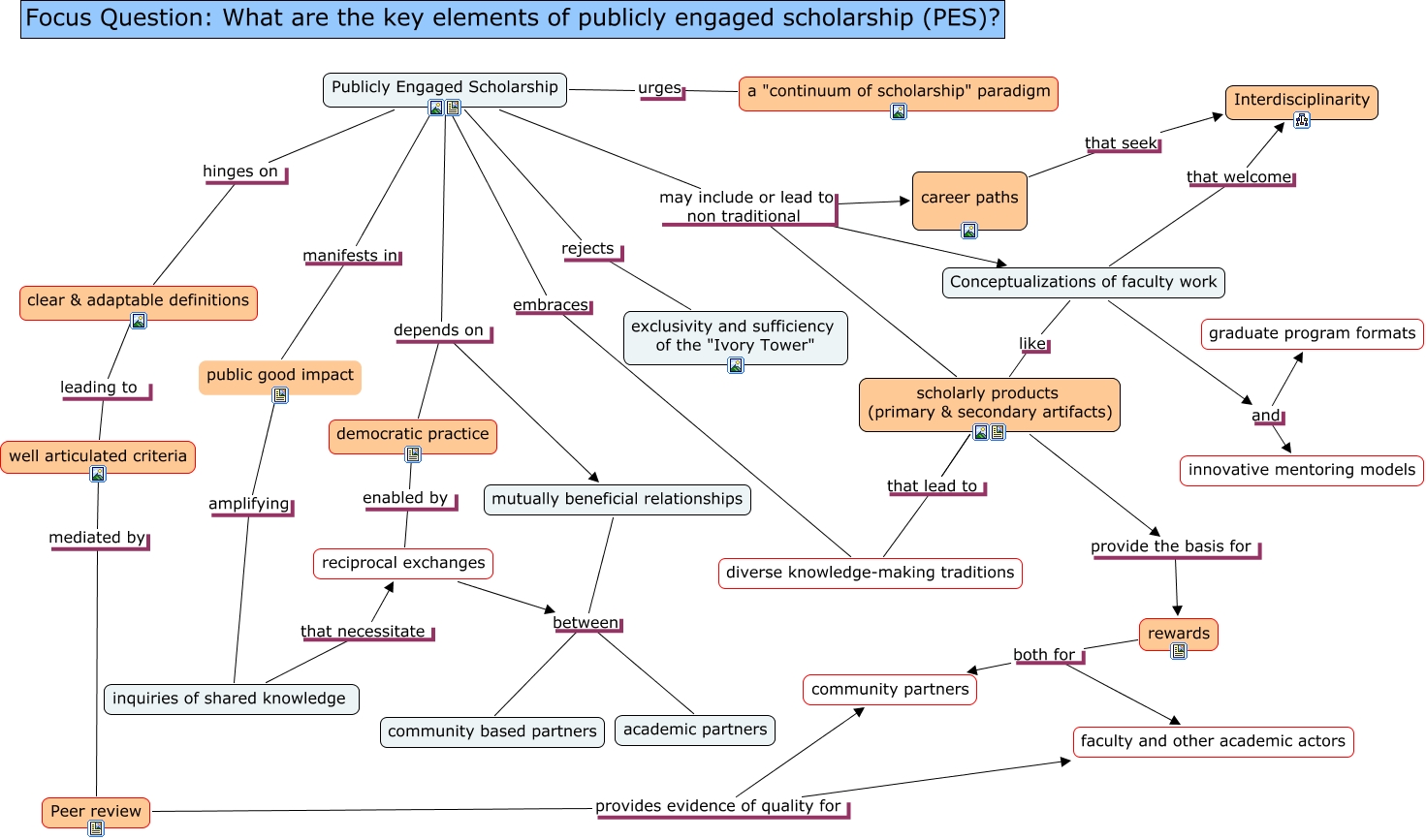 This Concept Map, created with IHMC CmapTools, has information related to: Publicly Engaged ScholarshipV6, scholarly products (primary & secondary artifacts) provide the basis for rewards, mutually beneficial relationships between community based partners, Conceptualizations of faculty work that welcome Interdisciplinarity, rewards both for faculty and other academic actors, rewards both for community partners, Publicly Engaged Scholarship may include or lead to non traditional Conceptualizations of faculty work, Publicly Engaged Scholarship urges a "continuum of scholarship" paradigm, inquiries of shared knowledge that necessitate reciprocal exchanges, Publicly Engaged Scholarship hinges on clear & adaptable definitions, well articulated criteria mediated by Peer review, Publicly Engaged Scholarship may include or lead to non traditional career paths, Publicly Engaged Scholarship depends on mutually beneficial relationships, inquiries of shared knowledge amplifying public good impact, Peer review provides evidence of quality for community partners, Publicly Engaged Scholarship depends on democratic practice, academic partners between community based partners, reciprocal exchanges between community based partners, Conceptualizations of faculty work like scholarly products (primary & secondary artifacts), Publicly Engaged Scholarship manifests in public good impact, diverse knowledge-making traditions embraces Publicly Engaged Scholarship