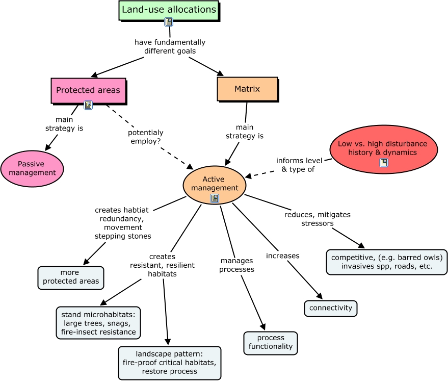 This Concept Map, created with IHMC CmapTools, has information related to: CC land use allocation, Land-use allocations have fundamentally different goals Protected areas, Land-use allocations have fundamentally different goals Matrix, Active management creates resistant, resilient habitats stand microhabitats: large trees, snags, fire-insect resistance, Protected areas main strategy is Passive management, Matrix main strategy is Active management, Active management increases connectivity, Active management creates habtiat redundancy, movement stepping stones more protected areas, Active management reduces, mitigates stressors competitive, (e.g. barred owls) invasives spp, roads, etc., Protected areas potentialy employ? Active management, Low vs. high disturbance history & dynamics informs level & type of Active management, Active management manages processes process functionality, Active management creates resistant, resilient habitats landscape pattern: fire-proof critical habitats, restore process