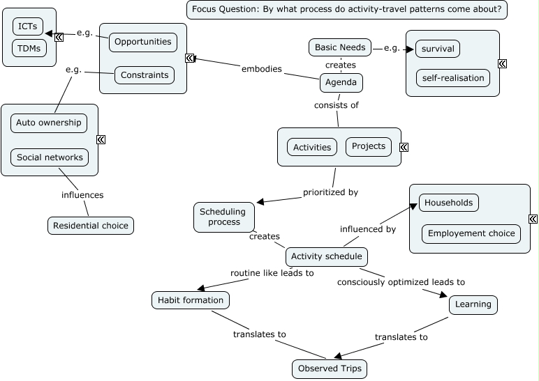 This Concept Map, created with IHMC CmapTools, has information related to: Activity-Travel_Behaviour_Jan 23, Activity schedule consciously optimized leads to Learning, ???? prioritized by Scheduling process, Activity schedule routine like leads to Habit formation, Basic Needs creates Agenda, Constraints e.g. Auto ownership, Agenda embodies ????, Scheduling process creates Activity schedule, Opportunities e.g. ICTs, Learning translates to Observed Trips, Basic Needs e.g. survival, Habit formation translates to Observed Trips, Agenda consists of ????, Social networks influences Residential choice, Activity schedule influenced by Households