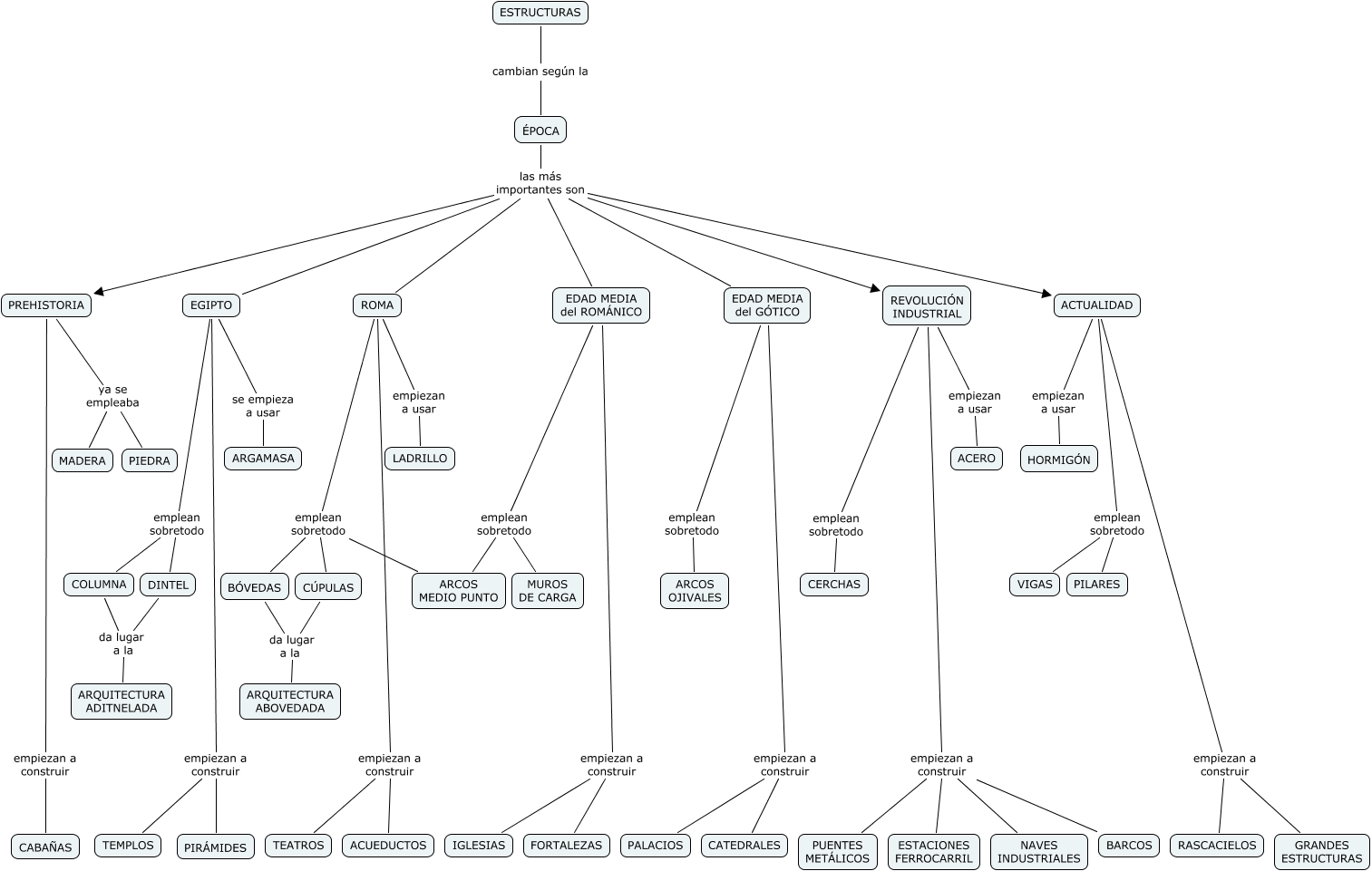 Este Cmap, tiene información relacionada con: 2eso_pag107, DINTEL da lugar a la ARQUITECTURA ADITNELADA, ROMA empiezan a construir ACUEDUCTOS, ÉPOCA las más importantes son EDAD MEDIA del GÓTICO, COLUMNA da lugar a la ARQUITECTURA ADITNELADA, ACTUALIDAD empiezan a construir GRANDES ESTRUCTURAS, EDAD MEDIA del GÓTICO empiezan a construir PALACIOS, REVOLUCIÓN INDUSTRIAL empiezan a construir BARCOS, EDAD MEDIA del ROMÁNICO emplean sobretodo MUROS DE CARGA, CÚPULAS da lugar a la ARQUITECTURA ABOVEDADA, EDAD MEDIA del GÓTICO emplean sobretodo ARCOS OJIVALES, ESTRUCTURAS cambian según la ÉPOCA, ROMA emplean sobretodo CÚPULAS, EDAD MEDIA del ROMÁNICO empiezan a construir IGLESIAS, REVOLUCIÓN INDUSTRIAL empiezan a construir NAVES INDUSTRIALES, EDAD MEDIA del GÓTICO empiezan a construir CATEDRALES, REVOLUCIÓN INDUSTRIAL empiezan a usar ACERO, BÓVEDAS da lugar a la ARQUITECTURA ABOVEDADA, ACTUALIDAD emplean sobretodo PILARES, ACTUALIDAD empiezan a construir RASCACIELOS, EGIPTO empiezan a construir TEMPLOS