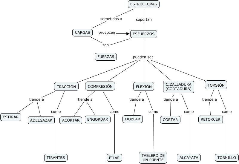 Este Cmap, tiene información relacionada con: 2eso_pag108-109, ESFUERZOS pueden ser CIZALLADURA (CORTADURA), ESFUERZOS son FUERZAS, TRACCIÓN como TIRANTES, ESFUERZOS pueden ser FLEXIÓN, COMPRESIÓN tiende a ENGORDAR, ESFUERZOS pueden ser COMPRESIÓN, ESTRUCTURAS soportan ESFUERZOS, TORSIÓN como TORNILLO, ESFUERZOS pueden ser TORSIÓN, ESTRUCTURAS sometidas a CARGAS, CIZALLADURA (CORTADURA) como ALCAYATA, TRACCIÓN tiende a ESTIRAR, FLEXIÓN tiende a DOBLAR, ESFUERZOS pueden ser TRACCIÓN, COMPRESIÓN tiende a ACORTAR, TORSIÓN tiende a RETORCER, CARGAS son FUERZAS, FLEXIÓN como TABLERO DE UN PUENTE, CIZALLADURA (CORTADURA) tiende a CORTAR, TRACCIÓN tiende a ADELGAZAR