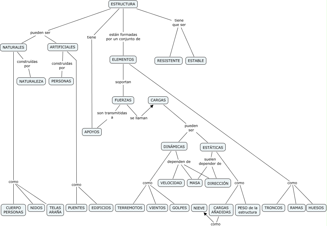 Este Cmap, tiene información relacionada con: 2eso_pag106, CARGAS pueden ser DINÁMICAS, DINÁMICAS como GOLPES, ESTÁTICAS suelen depender de DIRECCIÓN, ESTRUCTURA tiene que ser RESISTENTE, ARTIFICIALES como PUENTES, NATURALES construídas por NATURALEZA, ELEMENTOS soportan FUERZAS, ELEMENTOS como TRONCOS, ESTRUCTURA pueden ser ARTIFICIALES, DINÁMICAS dependen de MASA, DINÁMICAS como TERREMOTOS, CARGAS AÑADIDAS como NIEVE, NATURALES como CUERPO PERSONAS, NATURALES como NIDOS, ARTIFICIALES construidas por PERSONAS, DINÁMICAS como VIENTOS, ESTRUCTURA pueden ser NATURALES, DINÁMICAS dependen de DIRECCIÓN, FUERZAS se llaman CARGAS, ESTRUCTURA tiene APOYOS
