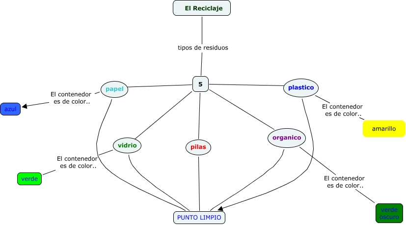 Este Cmap, tiene información relacionada con: el reciclaje, 5 ???? plastico, 5 ???? papel, papel PUNTO LIMPIO, organico PUNTO LIMPIO, El Reciclaje tipos de residuos 5, organico El contenedor es de color.. verde oscuro, vidrio PUNTO LIMPIO, plastico El contenedor es de color.. amarillo, vidrio El contenedor es de color.. verde, 5 organico, papel El contenedor es de color.. azul, pilas PUNTO LIMPIO, 5 pilas, plastico PUNTO LIMPIO, 5 ???? vidrio