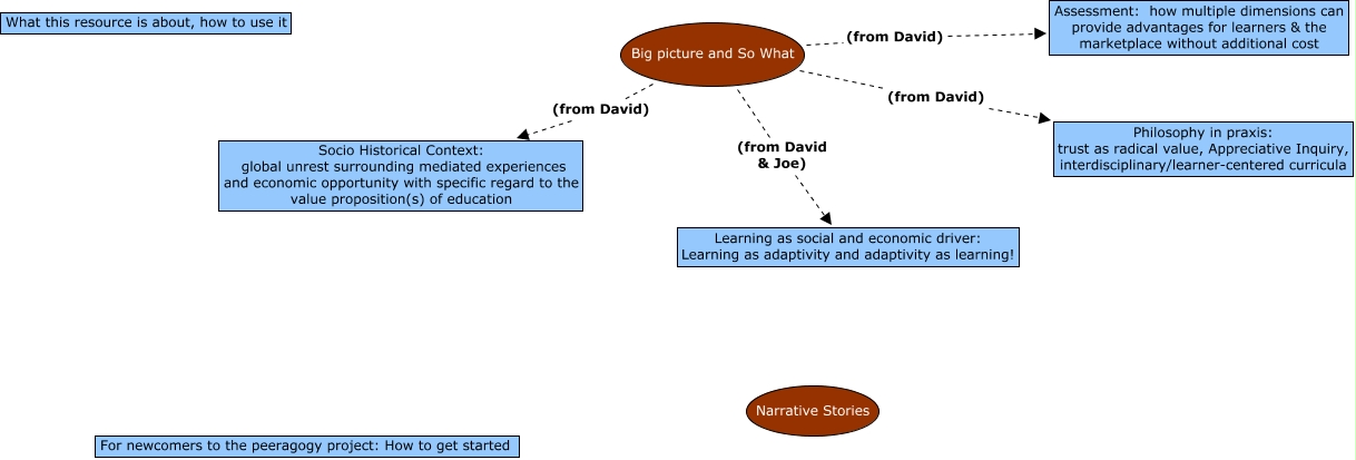 This Concept Map, created with IHMC CmapTools, has information related to: 1-Peeragogy-Introduction, Big picture and So What (from David) Assessment: how multiple dimensions can provide advantages for learners & the marketplace without additional cost, Big picture and So What (from David) Philosophy in praxis: trust as radical value, Appreciative Inquiry, interdisciplinary/learner-centered curricula, Big picture and So What (from David & Joe) Learning as social and economic driver: Learning as adaptivity and adaptivity as learning!, Big picture and So What (from David) Socio Historical Context: global unrest surrounding mediated experiences and economic opportunity with specific regard to the value proposition(s) of education