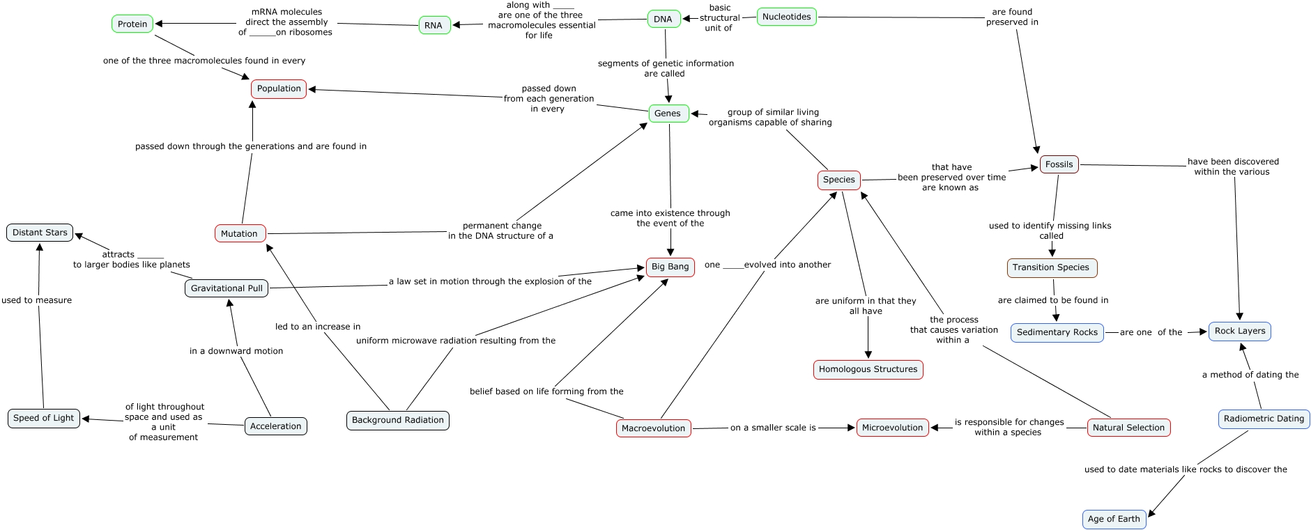 This Concept Map, created with IHMC CmapTools, has information related to: Evolution CMap Raya, Nucleotides basic structural unit of DNA, Species group of similar living organisms capable of sharing Genes, Gravitational Pull attracts _____ to larger bodies like planets Distant Stars, Background Radiation uniform microwave radiation resulting from the Big Bang, Fossils used to identify missing links called Transition Species, Species that have been preserved over time are known as Fossils, DNA segments of genetic information are called Genes, Mutation permanent change in the DNA structure of a Genes, DNA along with ____ are one of the three macromolecules essential for life RNA, Radiometric Dating a method of dating the Rock Layers, Acceleration in a downward motion Gravitational Pull, Gravitational Pull a law set in motion through the explosion of the Big Bang, Protein one of the three macromolecules found in every Population, Nucleotides are found preserved in Fossils, Macroevolution one ____evolved into another Species, Background Radiation led to an increase in Mutation, Genes came into existence through the event of the Big Bang, Speed of Light used to measure Distant Stars, Species are uniform in that they all have Homologous Structures, Genes passed down from each generation in every Population