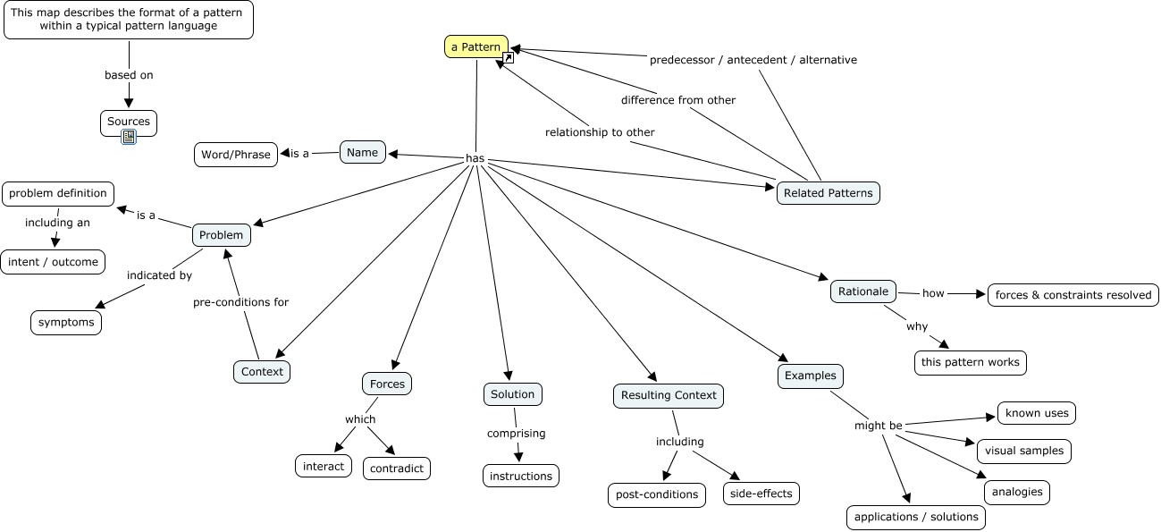This Concept Map, created with IHMC CmapTools, has information related to: Pattern Format, Examples might be visual samples, Problem indicated by symptoms, a Pattern has Name, Resulting Context including side-effects, a Pattern has Solution, Examples might be applications / solutions, Rationale why this pattern works, Solution comprising instructions, a Pattern has Forces, Problem is a problem definition, a Pattern has Problem, a Pattern has Context, This map describes the format of a pattern within a typical pattern language based on Sources, Resulting Context including post-conditions, Name is a Word/Phrase, Related Patterns difference from other a Pattern, Related Patterns relationship to other a Pattern, Forces which contradict, Forces which interact, Examples might be known uses