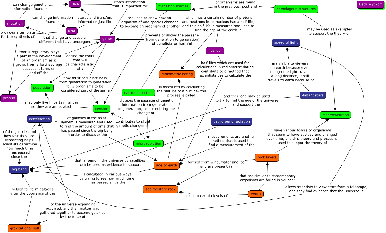This Concept Map, created with IHMC CmapTools, has information related to: Wyckoff_Evolution, microevolution contributes to slight genetic changes in species, age of earth is calculated in various ways by trying to see how much time has passed since the big bang, natural selection dictates the passage of genetic information from generation to generation, so it can bring the change of microevolution, natural selection prevents or allows the passage (from generation to generation) of beneficial or harmful genes, RNA provides a template for the synthesis of protein, genes that change and cause a different trait have undergone mutation, homologous structures may be used as examples to support the theory of macroevolution, mutation can change genetic information found in DNA, distant stars are visible to viewers on earth because even though the light travels a long distance, it still travels to earth because of speed of light, distant stars and their age may be used to try to find the age of the universe and support the big bang, acceleration of the universe expanding occurred, and then matter was gathered together to become galaxies by the force of gravitational pull, protein that is regulatory plays a part in the development of an organism as it grows from a fertilized egg because it turns on and off the genes, acceleration of galaxies in the solar system is measured and used to find the amount of time that has passed since the big bang in order to discover the age of earth, mutation can change information found in RNA, nuclide half-lifes which are used for calculations in radiometric dating contribute to a method that scientists use to calculate the age of earth, rock layers formed from wind, water and ice and are present in sedimentary rock, homologous structures of organisms are found in the previous, post and transition species, gravitational pull helped for form galaxies after the occurance of the big bang, speed of light allows scientists to view stars from a telescope, and they find evidence that the universe is acceleration, background radiation that is found in the universe by satellites can be used as evidence to support big bang
