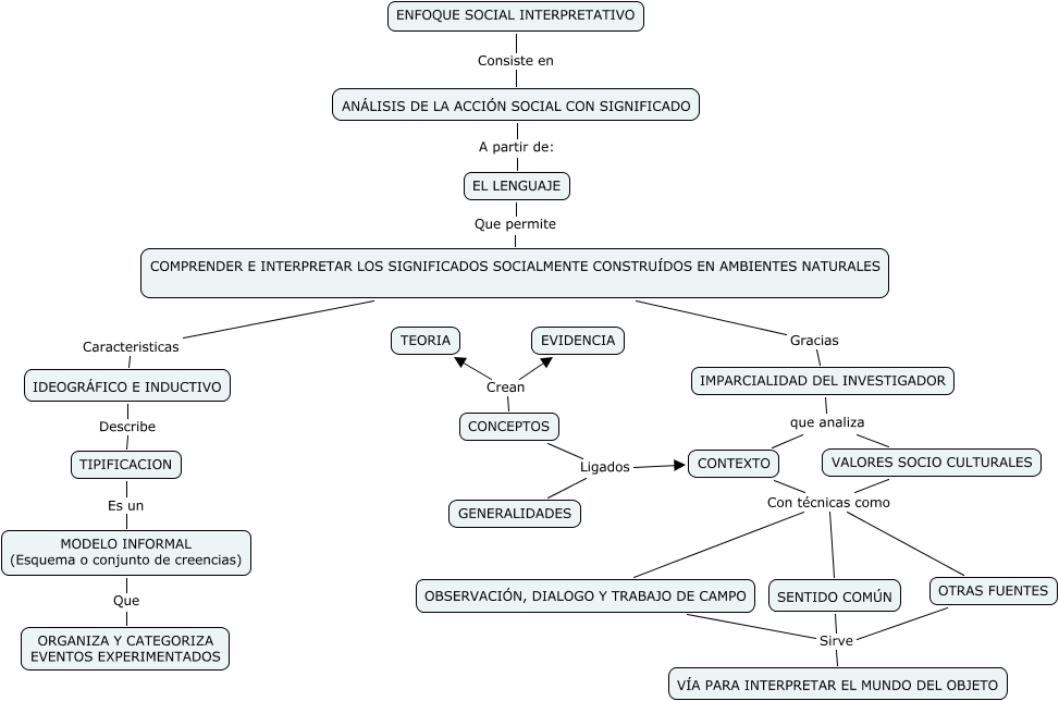 Este Cmap, tiene información relacionada con: enfoque interpretativo, CONTEXTO Con técnicas como OTRAS FUENTES, SENTIDO COMÚN Sirve VÍA PARA INTERPRETAR EL MUNDO DEL OBJETO, OBSERVACIÓN, DIALOGO Y TRABAJO DE CAMPO Sirve VÍA PARA INTERPRETAR EL MUNDO DEL OBJETO, ENFOQUE SOCIAL INTERPRETATIVO Consiste en ANÁLISIS DE LA ACCIÓN SOCIAL CON SIGNIFICADO, VALORES SOCIO CULTURALES Con técnicas como OTRAS FUENTES, COMPRENDER E INTERPRETAR LOS SIGNIFICADOS SOCIALMENTE CONSTRUÍDOS EN AMBIENTES NATURALES Caracteristicas IDEOGRÁFICO E INDUCTIVO, CONTEXTO Con técnicas como OBSERVACIÓN, DIALOGO Y TRABAJO DE CAMPO, GENERALIDADES Ligados CONTEXTO, CONCEPTOS Crean TEORIA, EL LENGUAJE Que permite COMPRENDER E INTERPRETAR LOS SIGNIFICADOS SOCIALMENTE CONSTRUÍDOS EN AMBIENTES NATURALES, IMPARCIALIDAD DEL INVESTIGADOR que analiza VALORES SOCIO CULTURALES, VALORES SOCIO CULTURALES Con técnicas como SENTIDO COMÚN, CONCEPTOS Crean EVIDENCIA, VALORES SOCIO CULTURALES Con técnicas como OBSERVACIÓN, DIALOGO Y TRABAJO DE CAMPO, CONTEXTO Con técnicas como SENTIDO COMÚN, OTRAS FUENTES Sirve VÍA PARA INTERPRETAR EL MUNDO DEL OBJETO, IDEOGRÁFICO E INDUCTIVO Describe TIPIFICACION, MODELO INFORMAL (Esquema o conjunto de creencias) Que ORGANIZA Y CATEGORIZA EVENTOS EXPERIMENTADOS, CONCEPTOS Ligados CONTEXTO, TIPIFICACION Es un MODELO INFORMAL (Esquema o conjunto de creencias)