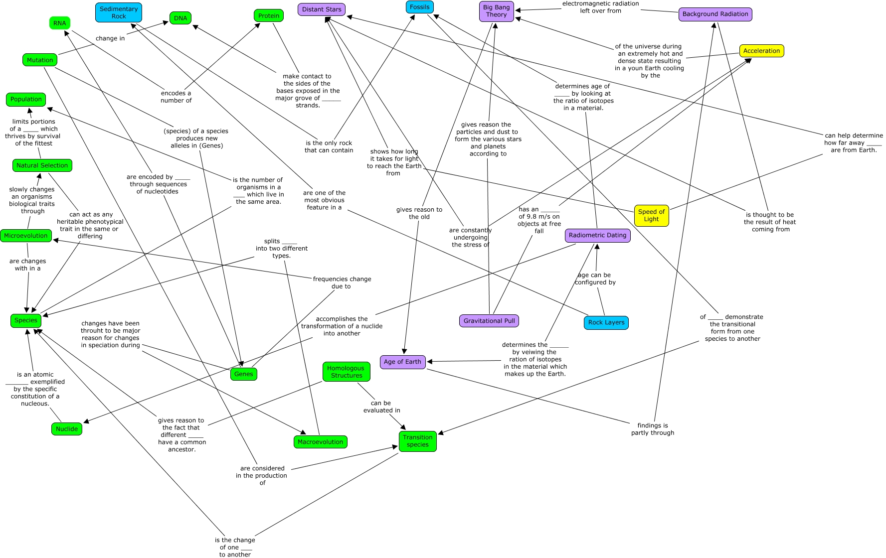 This Concept Map, created with IHMC CmapTools, has information related to: Kathy_evolution, Speed of Light can help determine how far away ____ are from Earth. Distant Stars, Mutation (species) of a species produces new alleles in (Genes) Genes, Homologous Structures can be evaluated in Transition species, Gravitational Pull gives reason the particles and dust to form the various stars and planets according to Big Bang Theory, Homologous Structures gives reason to the fact that different ____ have a common ancestor. Species, Radiometric Dating determines the _____ by veiwing the ration of isotopes in the material which makes up the Earth. Age of Earth, Gravitational Pull has an _____ of 9.8 m/s on objects at free fall Acceleration, Natural Selection limits portions of a ____ which thrives by survival of the fittest Population, Age of Earth findings is partly through Background Radiation, Big Bang Theory gives reason to the old Age of Earth, Radiometric Dating determines age of ____ by looking at the ratio of isotopes in a material. Fossils, Species is the number of organisms in a ___ which live in the same area. Population, Background Radiation electromagnetic radiation left over from Big Bang Theory, Background Radiation is thought to be the result of heat coming from Distant Stars, Acceleration of the universe during an extremely hot and dense state resulting in a youn Earth cooling by the Big Bang Theory, Mutation are considered in the production of Transition species, Genes changes have been throuht to be major reason for changes in speciation during Macroevolution, Transition species is the change of one ___ to another Species, Genes frequencies change due to Microevolution, Microevolution are changes with in a Species
