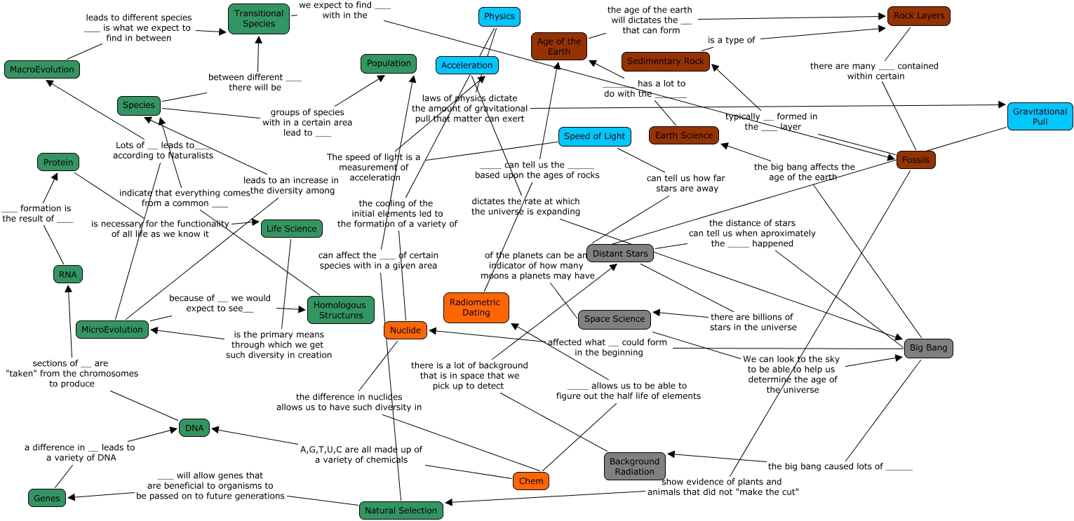 This Concept Map, created with IHMC CmapTools, has information related to: Evolution-Hans, Natural Selection can affect the ___ of certain species with in a given area Population, Distant Stars there are billions of stars in the universe Space Science, Age of the Earth the age of the earth will dictates the __ that can form Rock Layers, Natural Selection ___ will allow genes that are beneficial to organisms to be passed on to future generations Genes, Big Bang the big bang affects the age of the earth Earth Science, MicroEvolution Lots of __ leads to___ according to Naturalists MacroEvolution, Gravitational Pull of the planets can be an indicator of how many moons a planets may have Space Science, Fossils typically __ formed in the ___ layer Sedimentary Rock, Rock Layers there are many ___ contained within certain Fossils, Chem ____ allows us to be able to figure out the half life of elements Radiometric Dating, Transitional Species we expect to find ___ with in the Fossils, Distant Stars the distance of stars can tell us when aproximately the ____ happened Big Bang, Physics the cooling of the initial elements led to the formation of a variety of Nuclide, Life Science is the primary means through which we get such diversity in creation MicroEvolution, Genes a difference in __ leads to a variety of DNA DNA, Nuclide the difference in nuclides allows us to have such diversity in Chem, Speed of Light can tell us how far stars are away Distant Stars, Chem A,G,T,U,C are all made up of a variety of chemicals DNA, RNA ___ formation is the result of ___ Protein, Species between different ___ there will be Transitional Species
