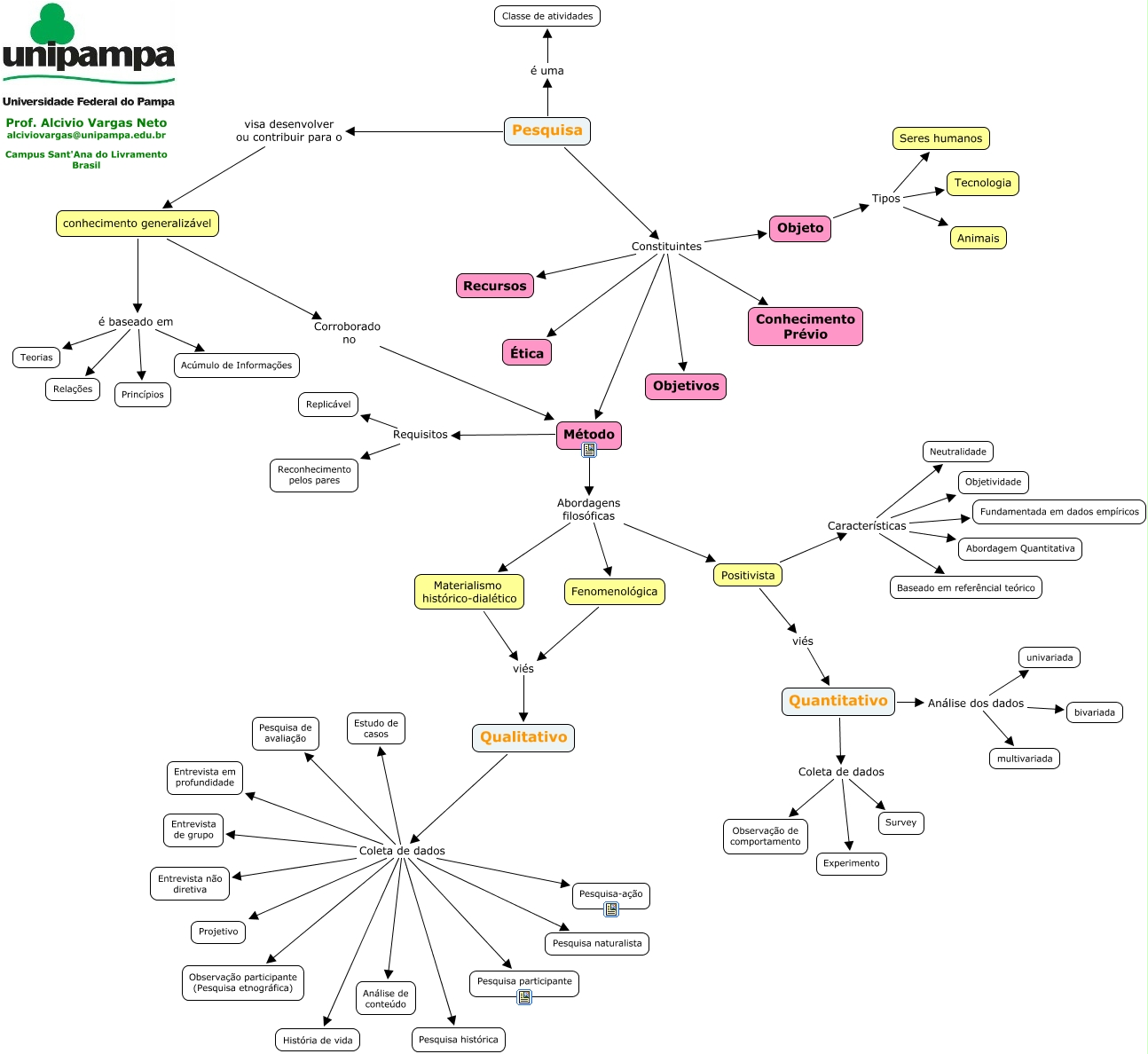 This Concept Map, created with IHMC CmapTools, has information related to: Pesquisa - Visão geral, Pesquisa Constituintes Ética, Método Requisitos Reconhecimento pelos pares, Método Abordagens filosóficas Materialismo histórico-dialético, Quantitativo Análise dos dados bivariada, Qualitativo Coleta de dados Pesquisa-ação, Fenomenológica viés Qualitativo, Materialismo histórico-dialético viés Qualitativo, Qualitativo Coleta de dados Entrevista não diretiva, Positivista Características Neutralidade, Quantitativo Análise dos dados multivariada, Pesquisa Constituintes Método, Pesquisa é uma Classe de atividades, Pesquisa Constituintes Objeto, Quantitativo Coleta de dados Observação de comportamento, Positivista Características Abordagem Quantitativa, Objeto Tipos Tecnologia, Qualitativo Coleta de dados História de vida, Objeto Tipos Animais, Qualitativo Coleta de dados Pesquisa participante, Qualitativo Coleta de dados Análise de conteúdo