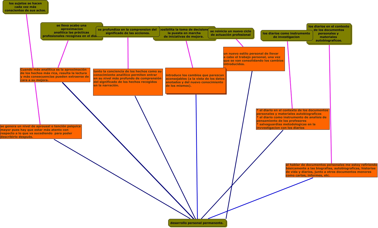 Este Cmap, tiene información relacionada con: MAPA CONCEPTUAL CAROLINA, se profundiza en la comprension del significado de las acciones. tanto la conciencia de los hechos como su conocimiento analítico permiten entrar en su nivel más profundo de comprensión del significado de los hechos recogidos en la narración. desarrollo personal permanente., se posibilita la toma de decisiones y la puesta en marcha de iniciativas de mejora. introduce los cambios que parezcan aconsejables (a la vista de los datos anotados y del nuevo conocimiento de los mismos). desarrollo personal permanente., los diarios en el contexto de los documentos personales y materiales autobiograficos. al hablar de documentos personales me estoy refiriendo básicamente a las biografías, autobiograficas, historias de vida y diarios, junto a otros documentos menores como cartas, informes, etc. desarrollo personal permanente., los sujetos se hacen cada vez más conscientes de sus actos. se genera un nivel de aprousal o tención psiquica mayor pues hay que estar más atento con respecto a lo que va sucediendo para poder describirlo después. desarrollo personal permanente., se lleva acabo una aproximacion analitica las prácticas profesionales recoginas en el diario Cuando más analítica es la aproximación de los hechos más rica, resulta la lectura y más consecuencias pueden extraerse de cara a su mejora. desarrollo personal permanente., los diarios como instrumento de investigacion * el diario en el contexto de los documentos personales y materiales autobiograficos * el diario como instrumento de analísis de pensamiento de los profesores * salvaguardias metodologicas en la invvestigacion con los diarios desarrollo personal permanente., se reinicia un nuevo ciclo de actuación profesional un nuevo estilo personal de llevar a cabo el trabajo personal, una vez que se van consolidando los cambios introducidos. desarrollo personal permanente.