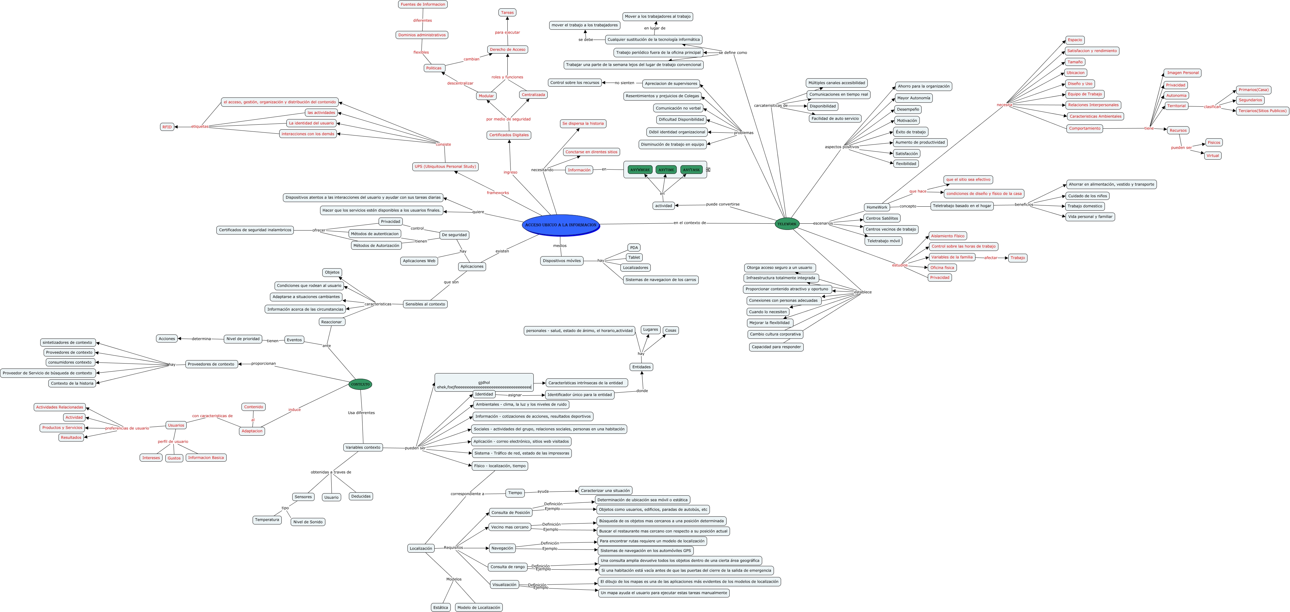 Este Cmap, tiene información relacionada con: MapaConceptual_v1, Navegación Ejemplo Sistemas de navegación en los automóviles GPS, Telework establece Cambio cultura corporativa, HomeWork necesita Satisfaccion y rendimiento, Proveedores de contexto hay Proveedor de Servicio de búsqueda de contexto, Dispositivos móviles hay PDA, Telework aspectos positivos Desempeño, HomeWork necesita Ubicacion, Recursos pueden ser Virtual, Telework se define como Cualquier sustitución de la tecnología informática, Adaptacion con caracteristicas de Usuarios, Entidades hay Lugares, HomeWork necesita Caracteristicas Ambientales, Privacidad ofrecer Certificados de seguridad inalambricos, Variables contexto pueden ser Identidad, Identificador único para la entidad donde Entidades, actividad en AnyTime, Acceso Ubicuo a la Informacion quiere Hacer que los servicios estén disponibles a los usuarios finales., Nivel de prioridad determina Acciones, Visualización Ejemplo Un mapa ayuda el usuario para ejecutar estas tareas manualmente, Localización Requisitos Consulta de rango