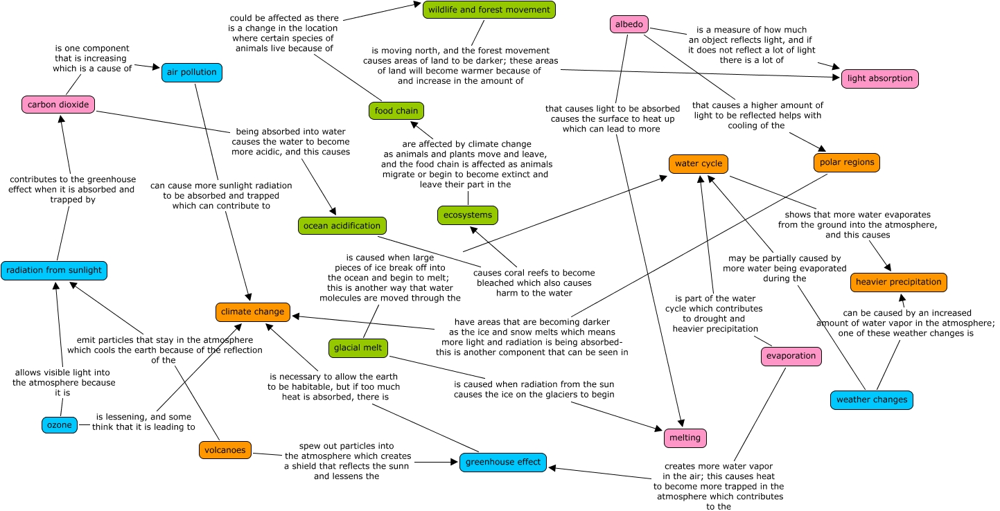 This Concept Map, created with IHMC CmapTools, has information related to: Wyckoff_Patterns and Changes, albedo that causes a higher amount of light to be reflected helps with cooling of the polar regions, air pollution can cause more sunlight radiation to be absorbed and trapped which can contribute to climate change, carbon dioxide being absorbed into water causes the water to become more acidic, and this causes ocean acidification, carbon dioxide is one component that is increasing which is a cause of air pollution, volcanoes emit particles that stay in the atmosphere which cools the earth because of the reflection of the radiation from sunlight, albedo is a measure of how much an object reflects light, and if it does not reflect a lot of light there is a lot of light absorption, polar regions have areas that are becoming darker as the ice and snow melts which means more light and radiation is being absorbed- this is another component that can be seen in climate change, food chain could be affected as there is a change in the location where certain species of animals live because of wildlife and forest movement, greenhouse effect is necessary to allow the earth to be habitable, but if too much heat is absorbed, there is climate change, glacial melt is caused when large pieces of ice break off into the ocean and begin to melt; this is another way that water molecules are moved through the water cycle, ozone allows visible light into the atmosphere because it is radiation from sunlight, volcanoes spew out particles into the atmosphere which creates a shield that reflects the sunn and lessens the greenhouse effect, evaporation creates more water vapor in the air; this causes heat to become more trapped in the atmosphere which contributes to the greenhouse effect, ocean acidification causes coral reefs to become bleached which also causes harm to the water ecosystems, albedo that causes light to be absorbed causes the surface to heat up which can lead to more melting, ecosystems are affected by climate change as animals and plants move and leave, and the food chain is affected as animals migrate or begin to become extinct and leave their part in the food chain, water cycle shows that more water evaporates from the ground into the atmosphere, and this causes heavier precipitation, weather changes may be partially caused by more water being evaporated during the water cycle, radiation from sunlight contributes to the greenhouse effect when it is absorbed and trapped by carbon dioxide, ozone is lessening, and some think that it is leading to climate change