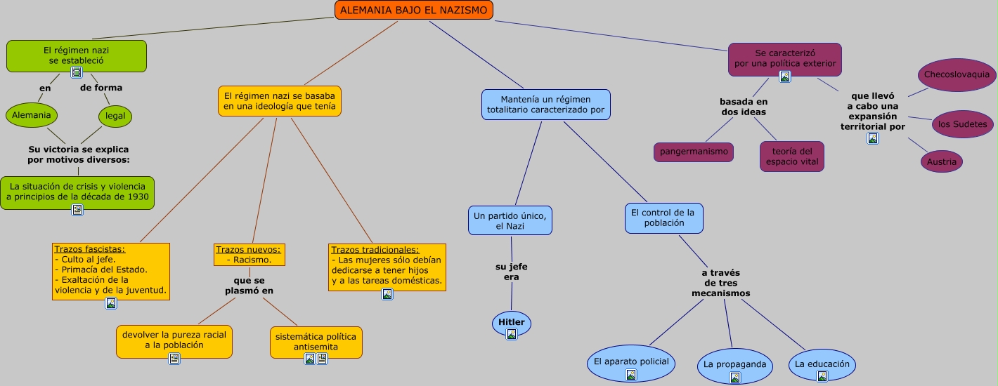 Este Cmap, tiene información relacionada con: Tarea 02, Se caracterizó por una política exterior que llevó a cabo una expansión territorial por Austria, Mantenía un régimen totalitario caracterizado por El control de la población, ALEMANIA BAJO EL NAZISMO Se caracterizó por una política exterior, El régimen nazi se estableció de forma legal, Mantenía un régimen totalitario caracterizado por Un partido único, el Nazi, El régimen nazi se estableció en Alemania, Trazos nuevos: - Racismo. que se plasmó en sistemática política antisemita, ALEMANIA BAJO EL NAZISMO El régimen nazi se basaba en una ideología que tenía, El control de la población a través de tres mecanismos El aparato policial, El régimen nazi se basaba en una ideología que tenía Trazos nuevos: - Racismo., El régimen nazi se basaba en una ideología que tenía Trazos fascistas: - Culto al jefe. - Primacía del Estado. - Exaltación de la violencia y de la juventud., Un partido único, el Nazi su jefe era Hitler, ALEMANIA BAJO EL NAZISMO Mantenía un régimen totalitario caracterizado por, El control de la población a través de tres mecanismos La educación, Se caracterizó por una política exterior basada en dos ideas teoría del espacio vital, ALEMANIA BAJO EL NAZISMO El régimen nazi se estableció, legal Su victoria se explica por motivos diversos: La situación de crisis y violencia a principios de la década de 1930, El control de la población a través de tres mecanismos La propaganda, El régimen nazi se basaba en una ideología que tenía Trazos tradicionales: - Las mujeres sólo debían dedicarse a tener hijos y a las tareas domésticas., Trazos nuevos: - Racismo. que se plasmó en devolver la pureza racial a la población