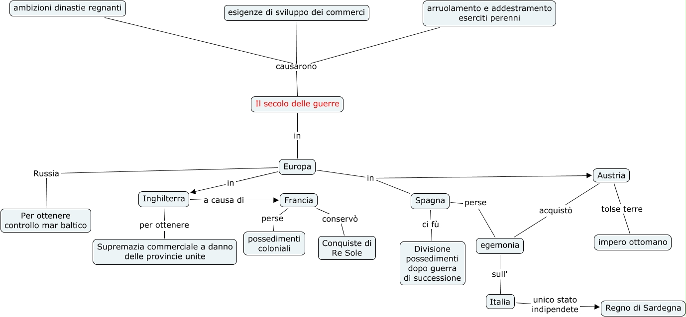 Questa Cmap, creata con IHMC CmapTools, contiene informazioni relative a: il secolo delle guerre, Inghilterra a causa di Francia, egemonia sull' Italia, Europa Russia Per ottenere controllo mar baltico, Italia unico stato indipendete Regno di Sardegna, ambizioni dinastie regnanti causarono Il secolo delle guerre, Austria acquistò egemonia, Europa in Austria, Francia perse possedimenti coloniali, arruolamento e addestramento eserciti perenni causarono Il secolo delle guerre, Inghilterra per ottenere Supremazia commerciale a danno delle provincie unite, Francia conservò Conquiste di Re Sole, Spagna ci fù Divisione possedimenti dopo guerra di successione, Europa in Spagna, Austria tolse terre impero ottomano, Europa in Inghilterra, Spagna perse egemonia, esigenze di sviluppo dei commerci causarono Il secolo delle guerre, Il secolo delle guerre in Europa